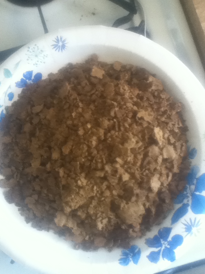 It now looks like chocolate flavored corn flakes. Try it in a bowl of milk, or add a few tablespoons of water to it in the Sierra Nevada Mountains and enjoy with tortillas.
