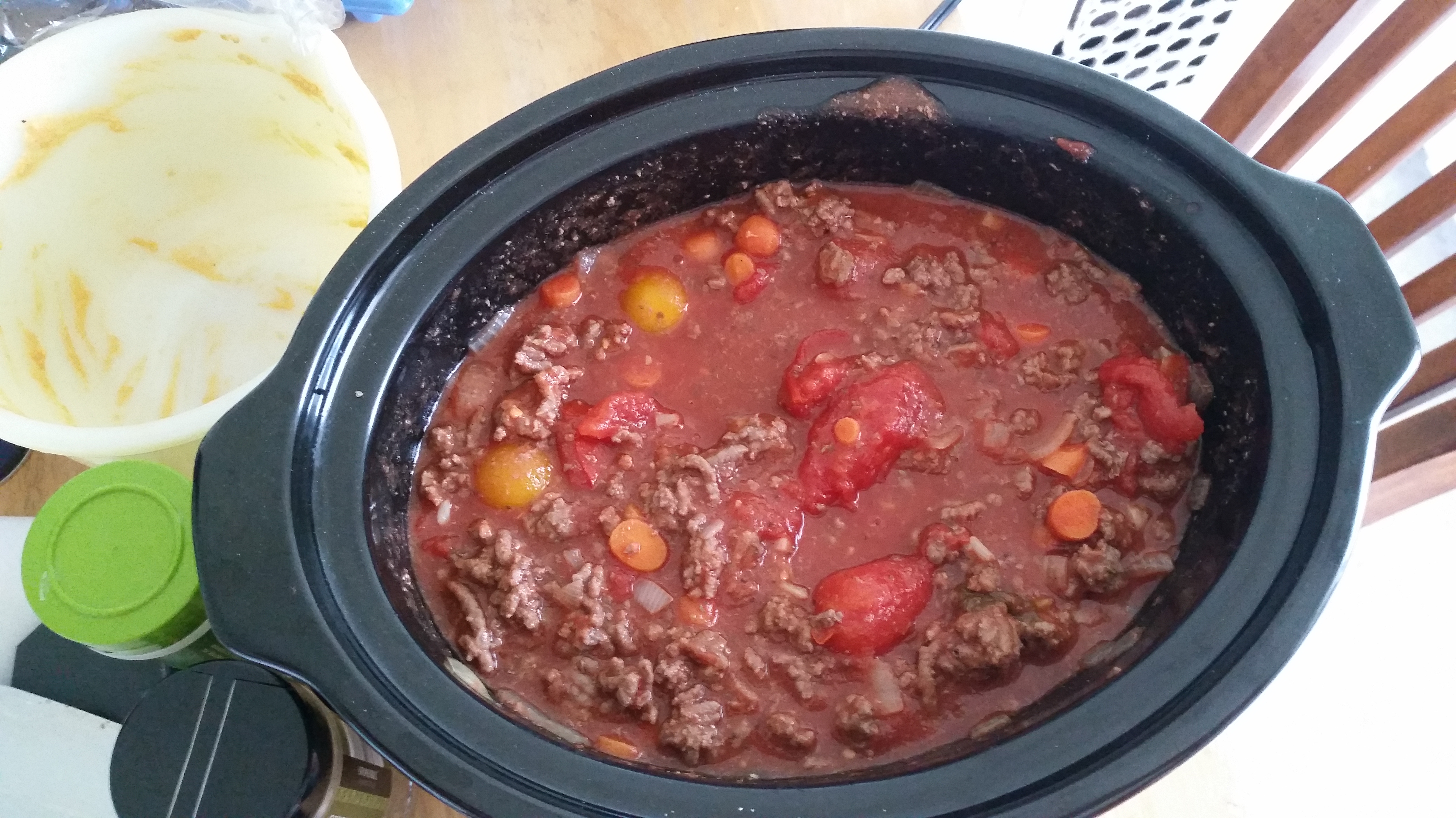 Put the canned tomatoes, tomato paste, cherry tomatoes, and 1.75 C. chicken stock in a crock pot. Add the salt, pepper, sambal, spices and stir. Saute the onion, garlic and carrot with salt and pepper in .25 C chicken stock. Add to crock pot. Brown the ground beef very thoroughly, drain the fat, place into colander, and rinse very very well. As much of the fat needs to be off the meat as possible. Add to the crock pot. At this point, it still looks very appetizing (this will change…).