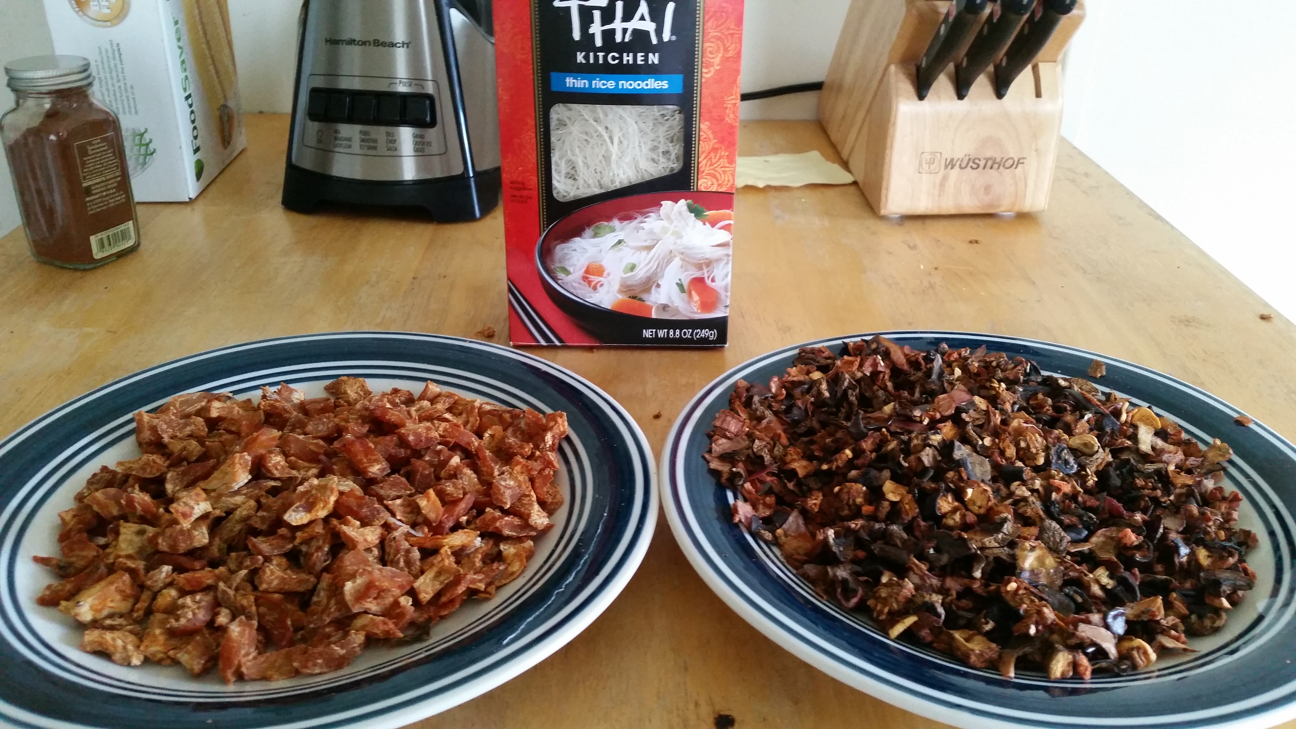 Dehydrate the vegetables and chicken for 15 or so hours at 145. I’ll pack a couple packets of soy sauce and a packet of Thai chili sauce for each noodle meal and add it at camp. The final product reading for portioning and vacuum sealing: