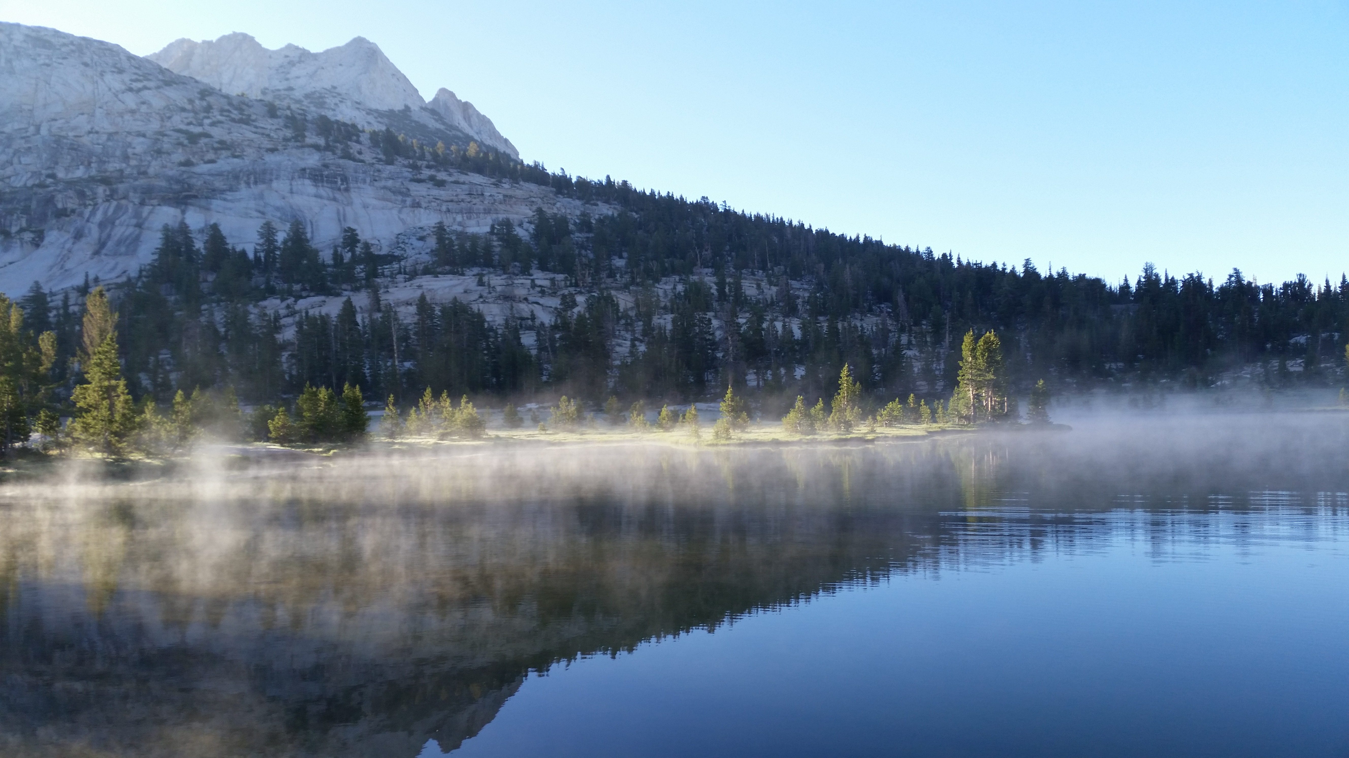 I wake to air so crisp and cold it could chip a tooth. The sky is blue and the surrounding mountains look lunar: pale, stark, severe. Last night, I was not visited by a bear. I begin my morning tasks: breaking down camp and loading my pack. I have become an efficient machine in this regard and have to pause and remind myself to be deliberate. Here, it is good to be precise and slow. I go to the lake and collect water. I dip my hand in and swoosh my reservoir bag back and forth, filling it to the brim. The water is warmer than the air and gives off a mist that glows in the early morning.
