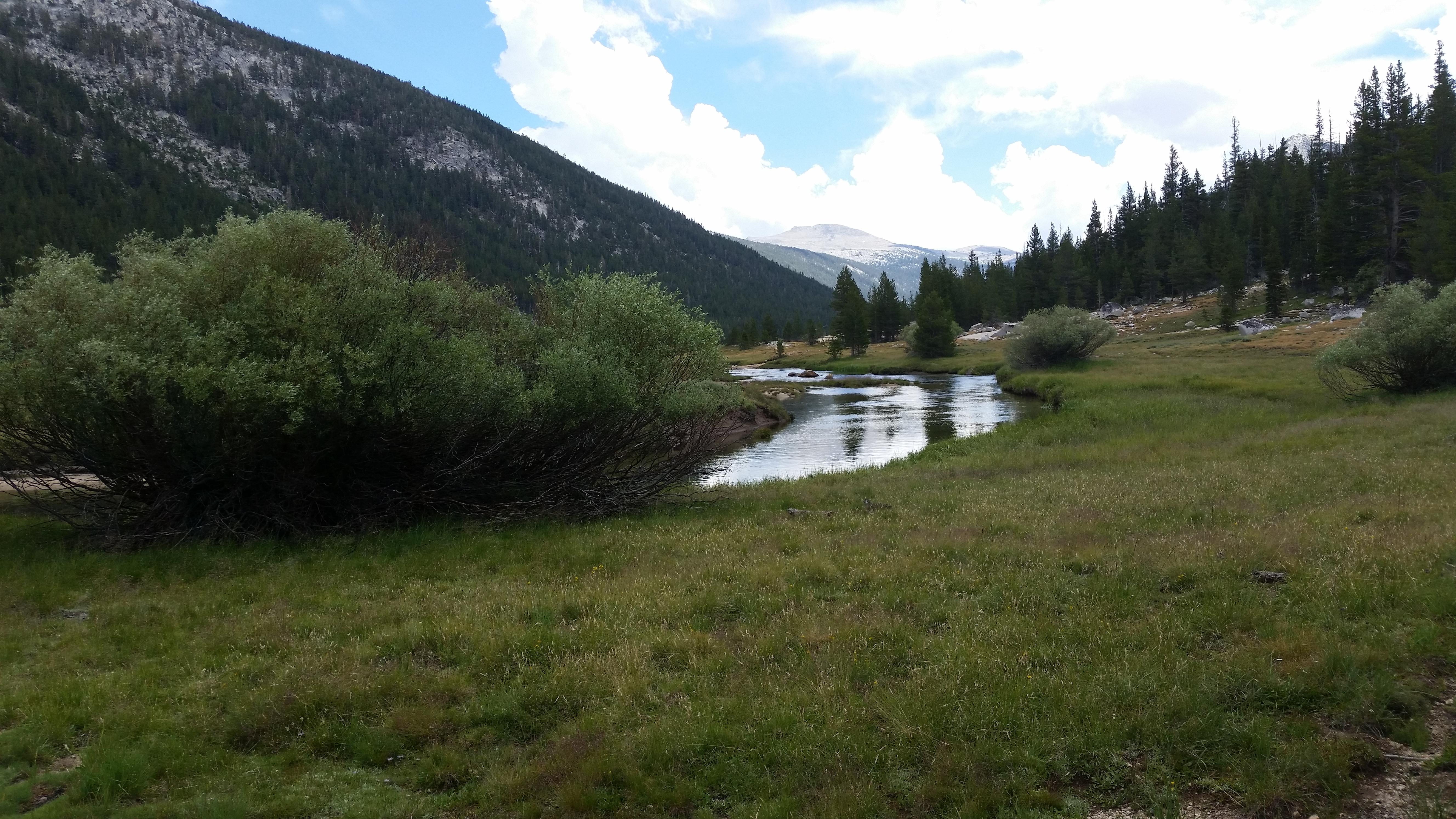 And it is beautiful. My pictures from this stretch of the trail win the award for “Doesn’t do the place justice.” The countryside is sweeping and grandiose. The mountains to the north are broad, towering, rounded. It remind me of the Rockies. They just look different from the mountains I’ve seen so far in the Sierras. Lyell Forks River cuts a wide and roundabout path back and forth through the meadow, its water running shallow. How did it become so meandering? What stood in its way? Grasses grow right up to the banks, which are raised above the river by a few feet. Fish jump from the water. Here and there, backpackers are sitting on rocks or with their feet dangling over the river, too transfixed to move on. Nobody, it appears, wants to leave. All of this is only a day hike (!) from Tuolumne! Why?! WHY? Isn’t this trail overrun with people?!?! Oh well. More open space for me. I eat trail mix and sip on water pulled from the river.