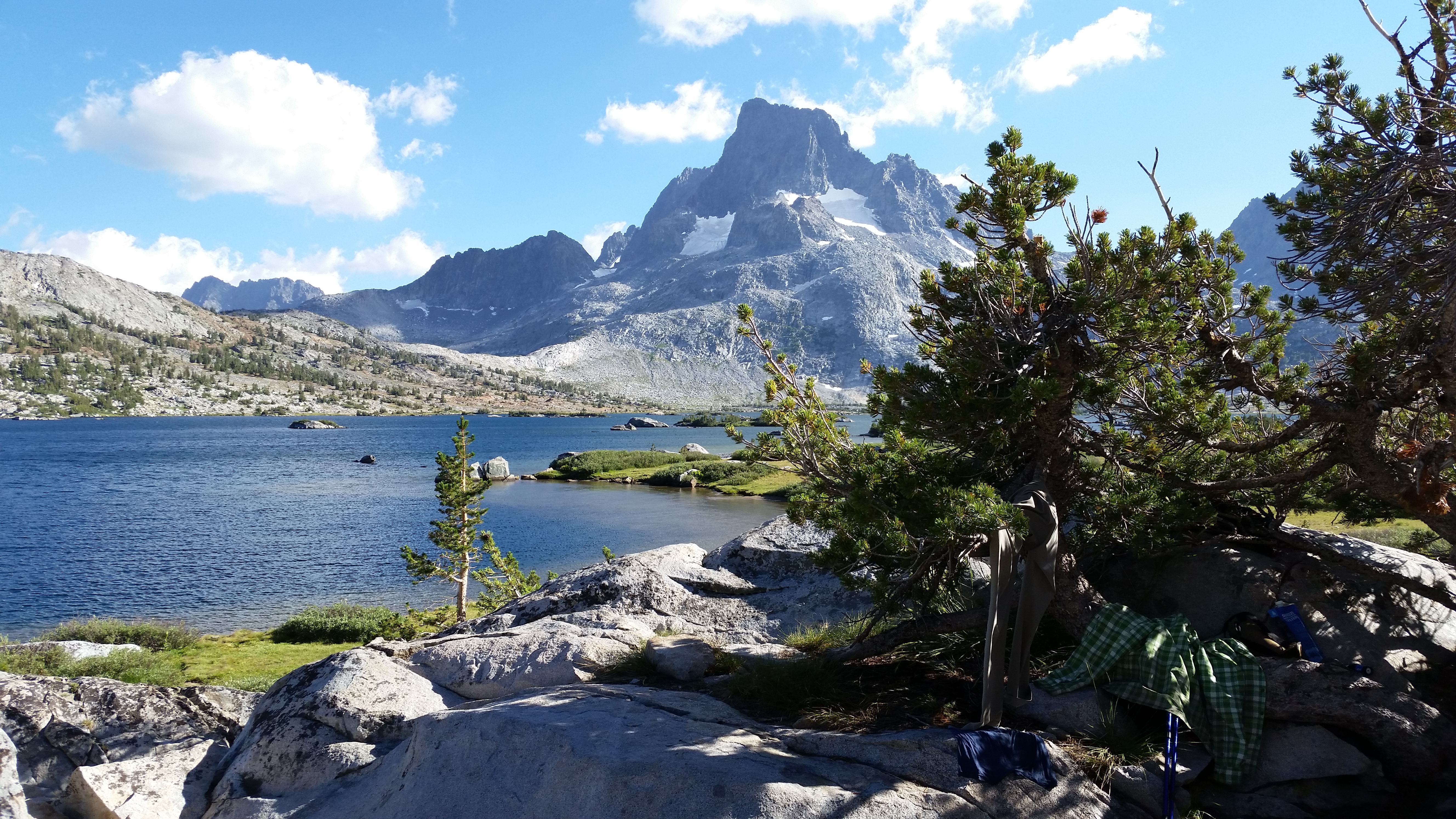I come to a rocky outcropping next to the lake, just below Banner Peak.  It is a giant of a mountain.  I sit down and decide not to go any farther.  This is a fine spot.  Far away, on the southwest shore I can see a couple tents with people moving around.  Let them have their privacy.