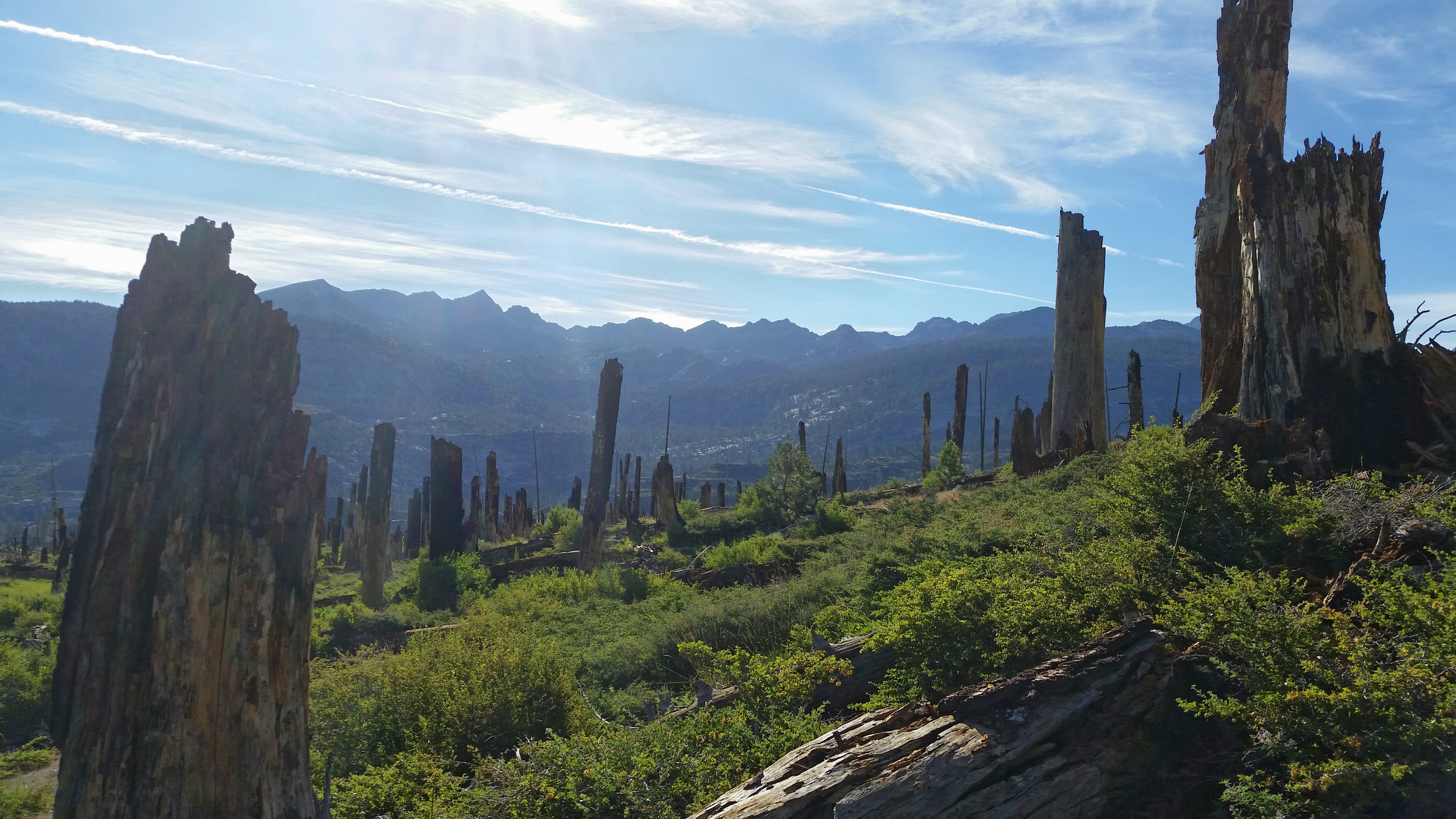 I felt very lonely and very much like giving up. For the first time on the hike I had lost my mental fortitude. It had kept me going strong for all these miles, but here, it deserted me. I looked around: so much destruction. I stopped completely. It was growing dark and the next campground was still over three miles and 1,000 feet up. What should I do? I could go back to Red’s, catch a bus, go to a hotel and stop right now. So easy. I’d seen some amazing things and hiked almost 100 miles and that was pretty good, right? In that moment, I had had enough and didn’t want to hike another step. What is the word that means: my mind has quit and I have lost my motivation and no part of me wants to be doing what I’m doing but I think I’m going to force myself to keep going anyway. Is there a word for that? Well, that’s what happened. All the dead trees seeped into my blood like some crazy disease and infected me. But I was going to keep walking. Just get through the day.