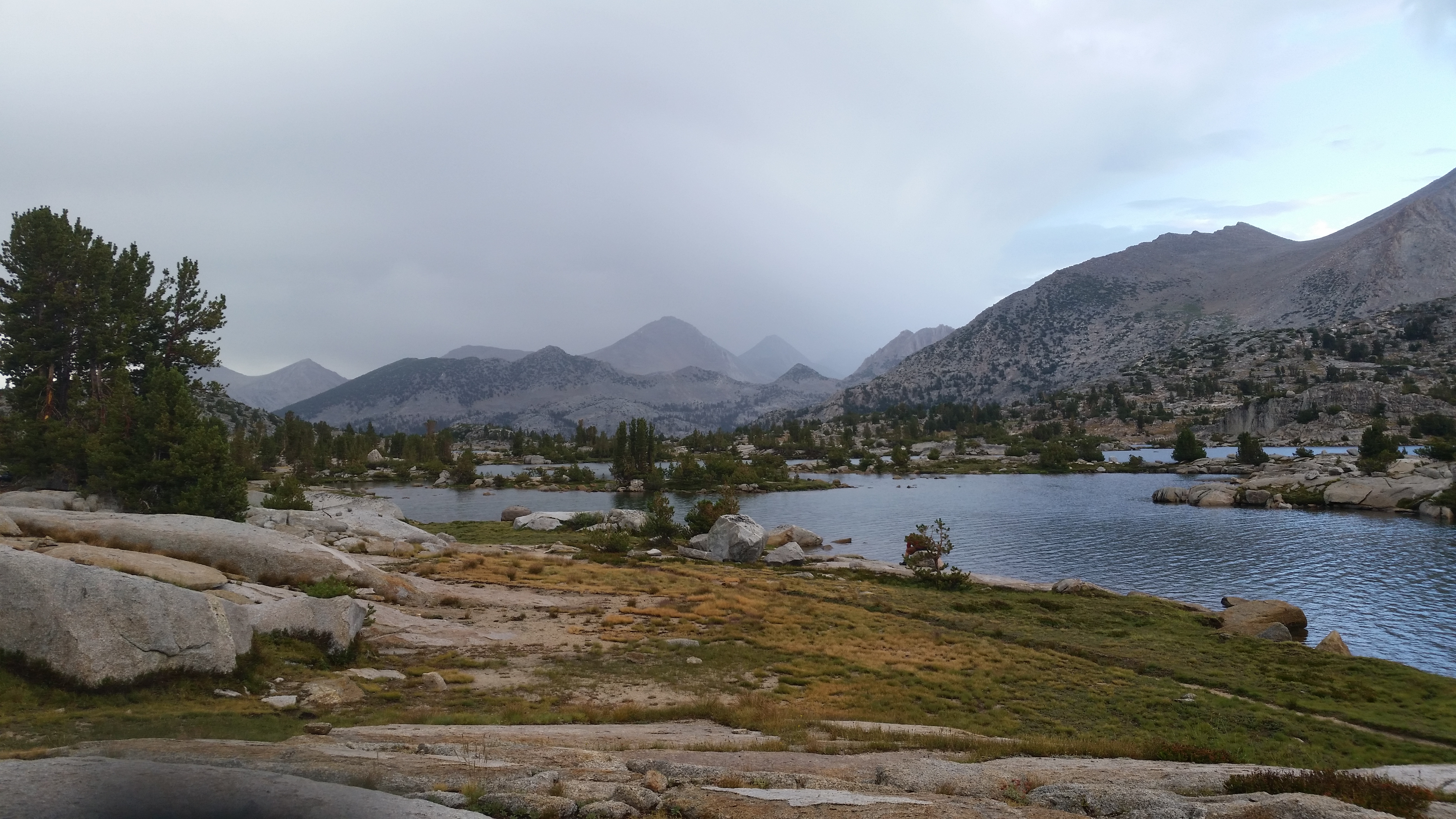 The rest of the afternoon is spent pushing my way through hordes of mosquitoes thick enough to part like the Red Sea. The air is muggy from the storm and menacing clouds still hang overhead, which makes me uneasy. For hours I don’t see anyone. Meanwhile, the trail goes higher and the landscape grows rougher. This is the land of over 10,000 feet. Deformed trees grow in clusters and rock dominates. Cliffs and mountains and boulders and pebbles are scattered as far as I can see. Then, around a corner: redemption! A meadow! I encourage everyone to appreciate your meadow, thank a meadow the next time you see one. They deserve it.