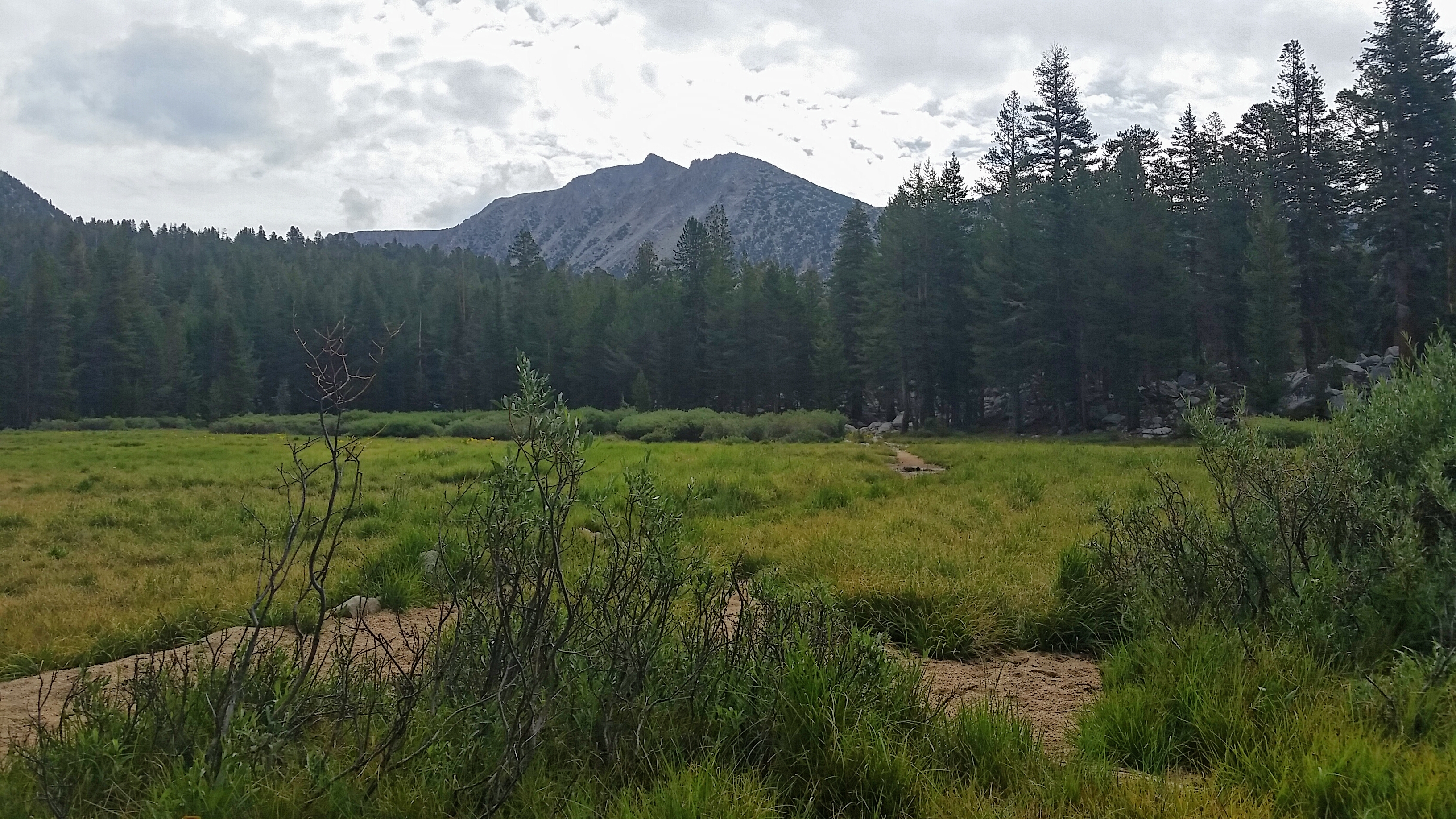 The clouds that formed yesterday and brought rain and storms are back again, and when I walk into Muir Trail Ranch rain is imminent. Luckily, its only 11 a.m., and I have time to pitch my tent while the world is still dry. I gather my resupply box and begin picking through my food. I jettison an entire gallon ziplock bag of oatmeal: too much weight. I meet a couple, Phil and Carol, who I assume are retired. They are also solo hikers who kept crossing paths on the trail and decided to stick together. It’s becoming a trend; its the cool thing to do. Start solo, join up with a group. I give away some packets of olive oil I don’t need and close the lid on my bear canister. 9 days of food all shoved into one clear-blue bucket.