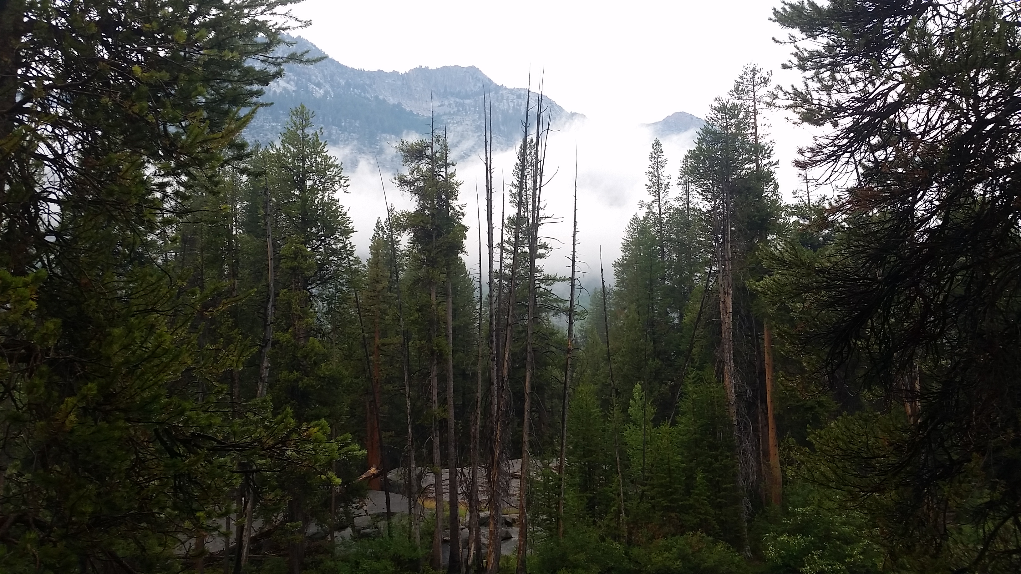 Hikers huddle together under a shelter and look out over the area. Brian is here after arriving yesterday. What’s going on? Why all the rain? I overhear a man saying he’s done long hikes in the Sierras every summer for the last 17 years, and never had one as wet as this. Every guidebook I read all said: rain and storms rare in the Sierras! Any weather that does roll in should be out in 30 minutes!