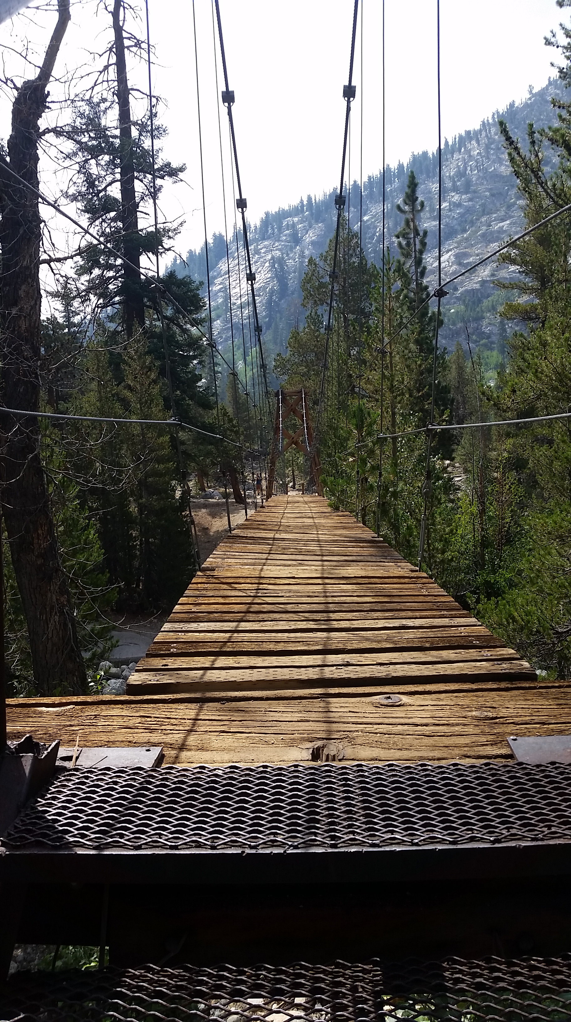 Morning hiking is great and I stay cool in the shadows of the mountains.  The river nearby has cut a gorge in the valley and crashes downhill, churning and spitting as it goes.  I come to the famous hanging bridge, which marks the end of my downhill climb, and the beginning of a 2,000 foot ascent to the Rae Lakes.