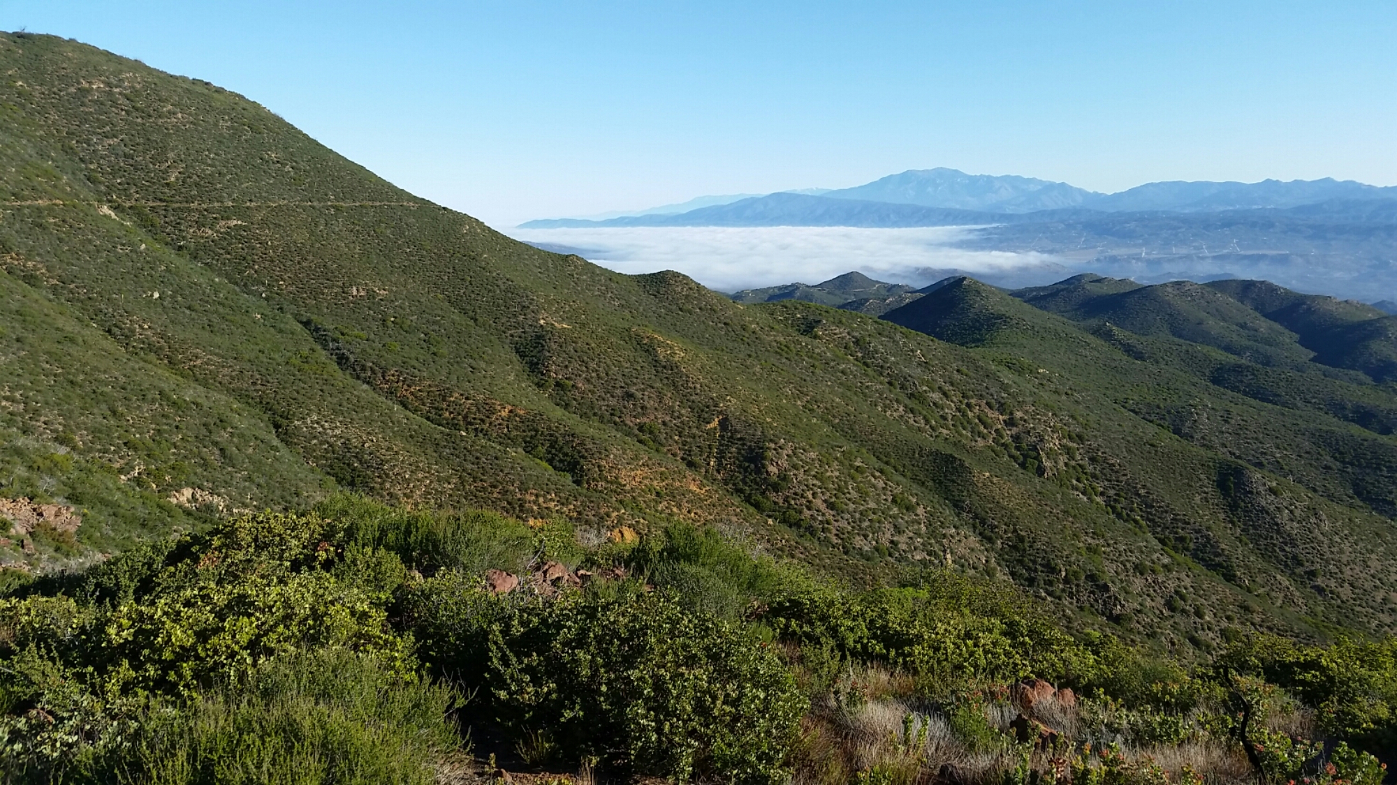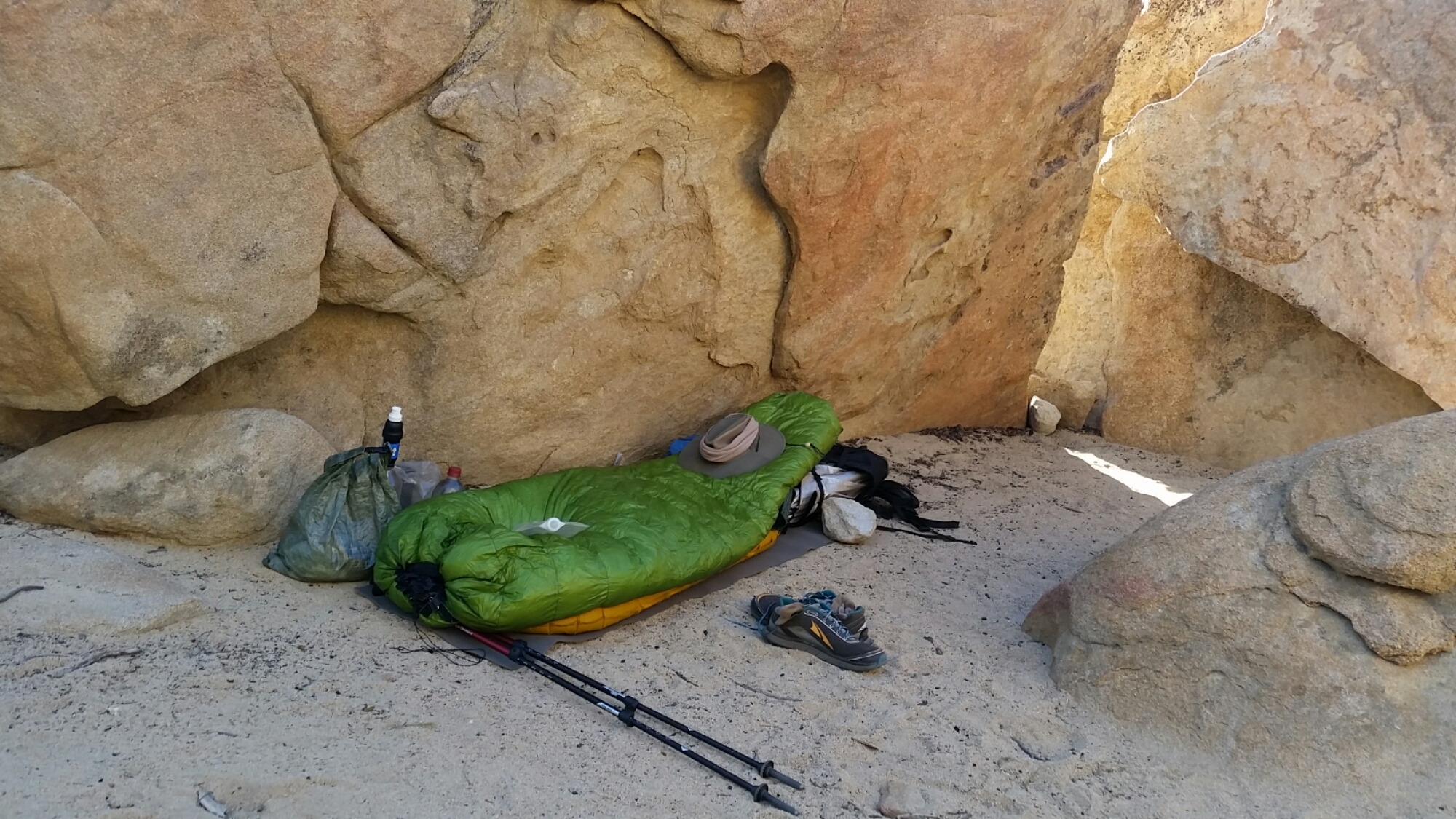 By afternoon I’m pretty beat up from the heat and find a nice boulder field to camp in. The site fills up and I sit on a rock and look into the valley as the sun goes down while I eat my peanut M&Ms.