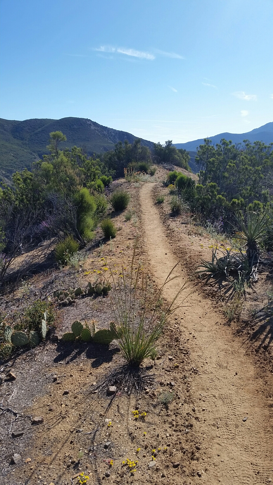 Morning’s nice and cool and I coast the 7 miles to highway 74. I stick my thumb out for a ride down to the cafe where I can get a hamburger and some water but can’t get a ride. I’m not very confident in my hitching abilities yet, so maybe I just didn’t give it enough time. Either way, I walk the mile down the highway and post up on a patio table for a couple hours and talk and eat and drink. When I leave I toss my thumb up again for a ride back to the trail and get a ride in under a minute (first ever successful hitch for me).