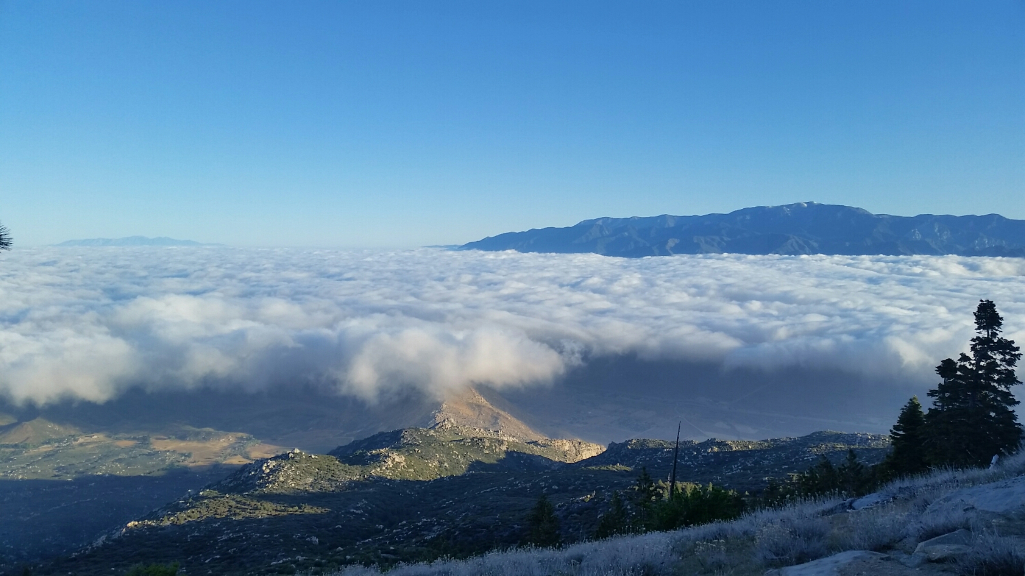 Slept hard and woke at half past 5. Hiking by 6 and trying to get miles before the sun gets too hot. I have to go all day without a water source so I’m trying to conserve. I eat some poptarts and brush my teeth while I’m walking, which is a great time saver. I look out into the valley, which is actually a desert, and can see a whole ocean of clouds underneath me. Mountains rise up like islands and I feel like a mariner lost at sea.