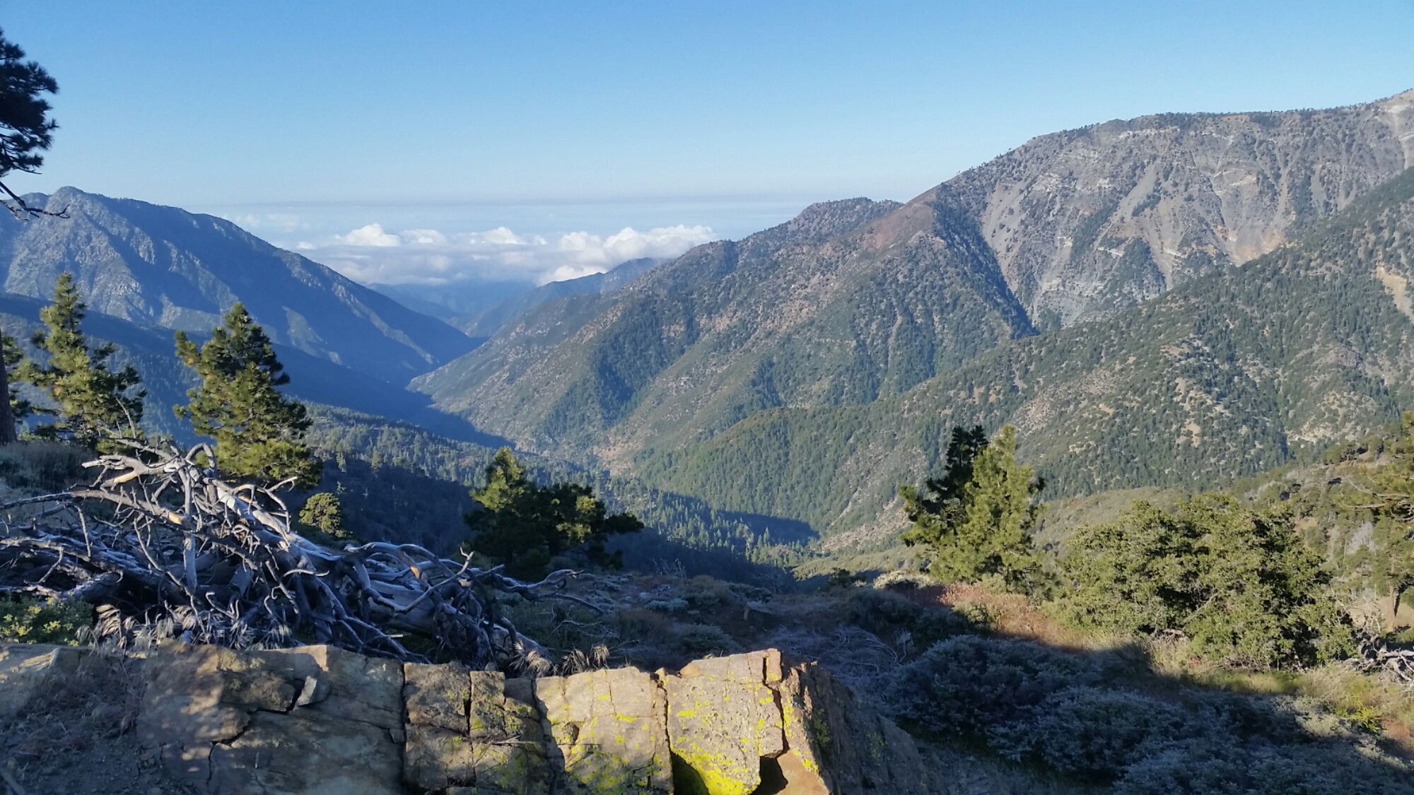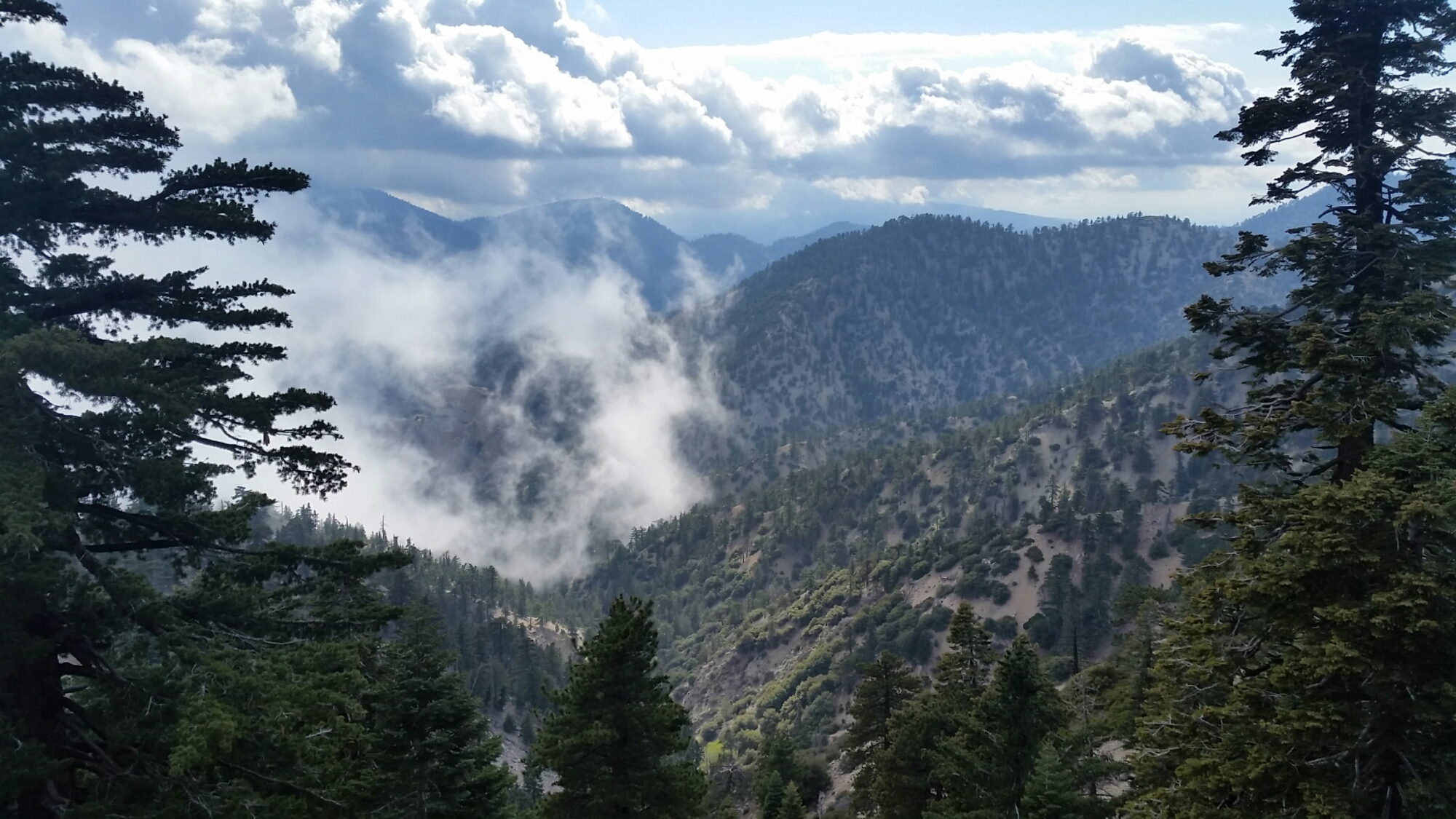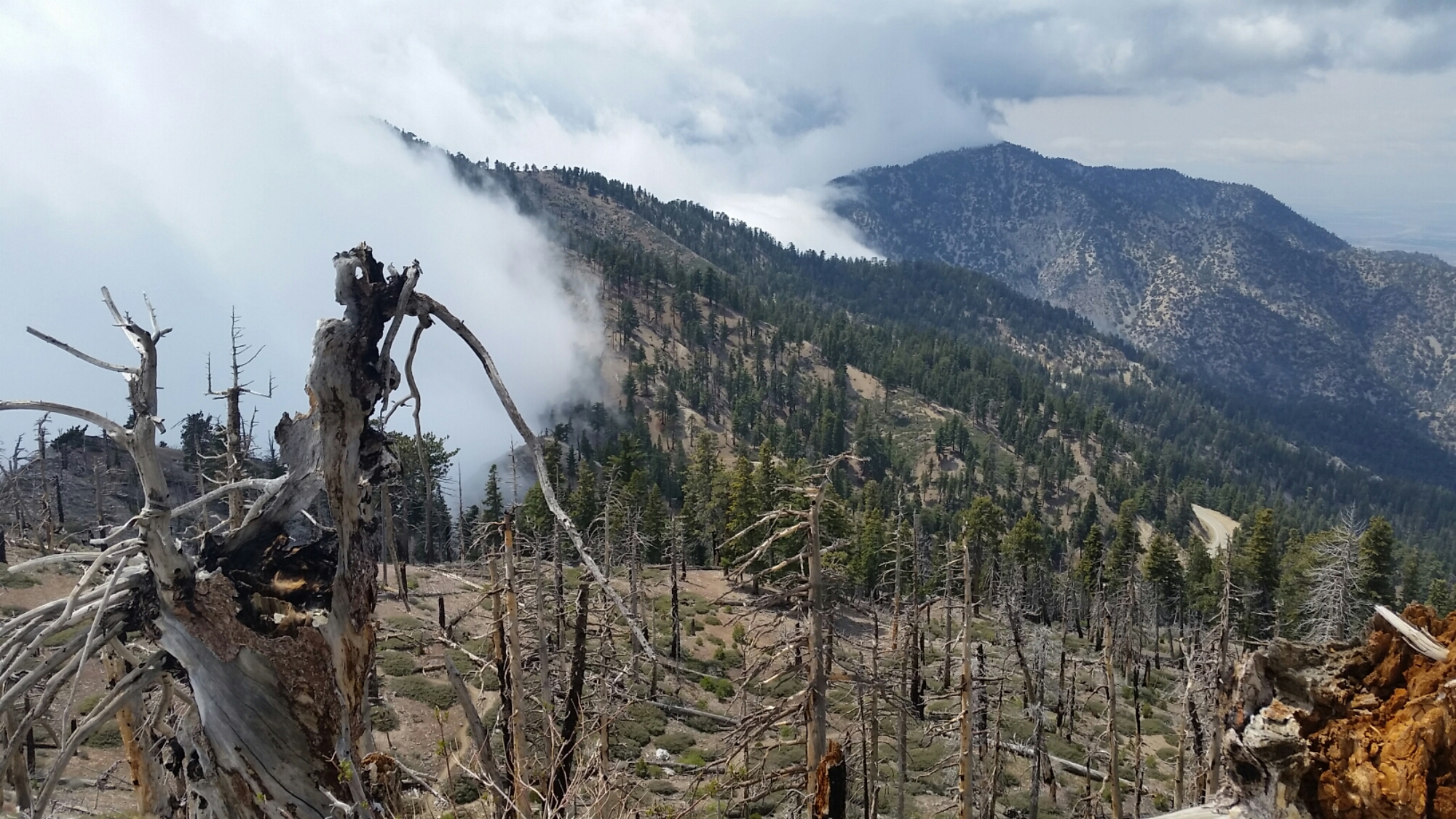 The masses gather and head to the mountaintop where nobody can see anything, on account of the clouds. A few hikers are gathered, smoking cigarettes and cursing up a storm. Clouds roll in off the wet Pacific and crest the ridge I’m walking on and get thrown back to whence they came by the warm dry air off the desert. It’s like I’m walking on an air-mass battlefield, with the clouds waging war over my head. The Mojave is winning.