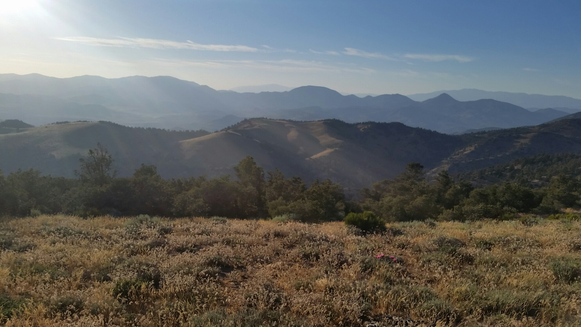The hills are brown, rolling, eroded away here and there and forming small gullies which channel the storm water. Meet up with Killer and Nate, never seen them before, and we walk a mile and a half to the highway where they hitch into town and I begin my climb up into the mountains. I get lost, and decide to return to the trail by walking cross country rather than backtracking. Of course, I take a nasty spill on a steep gravel ravine and land squarely on my pack. 20 minutes later I feel a drip and immediately realize the fall must have punctured my water bladder. So I take it out, find the leak, duct tape it, and position it in my pack so the drip faces up and that seems to solve the problem. I can’t afford to lose 2.5 liters of carrying capacity on this section, but I think the fix should hold.