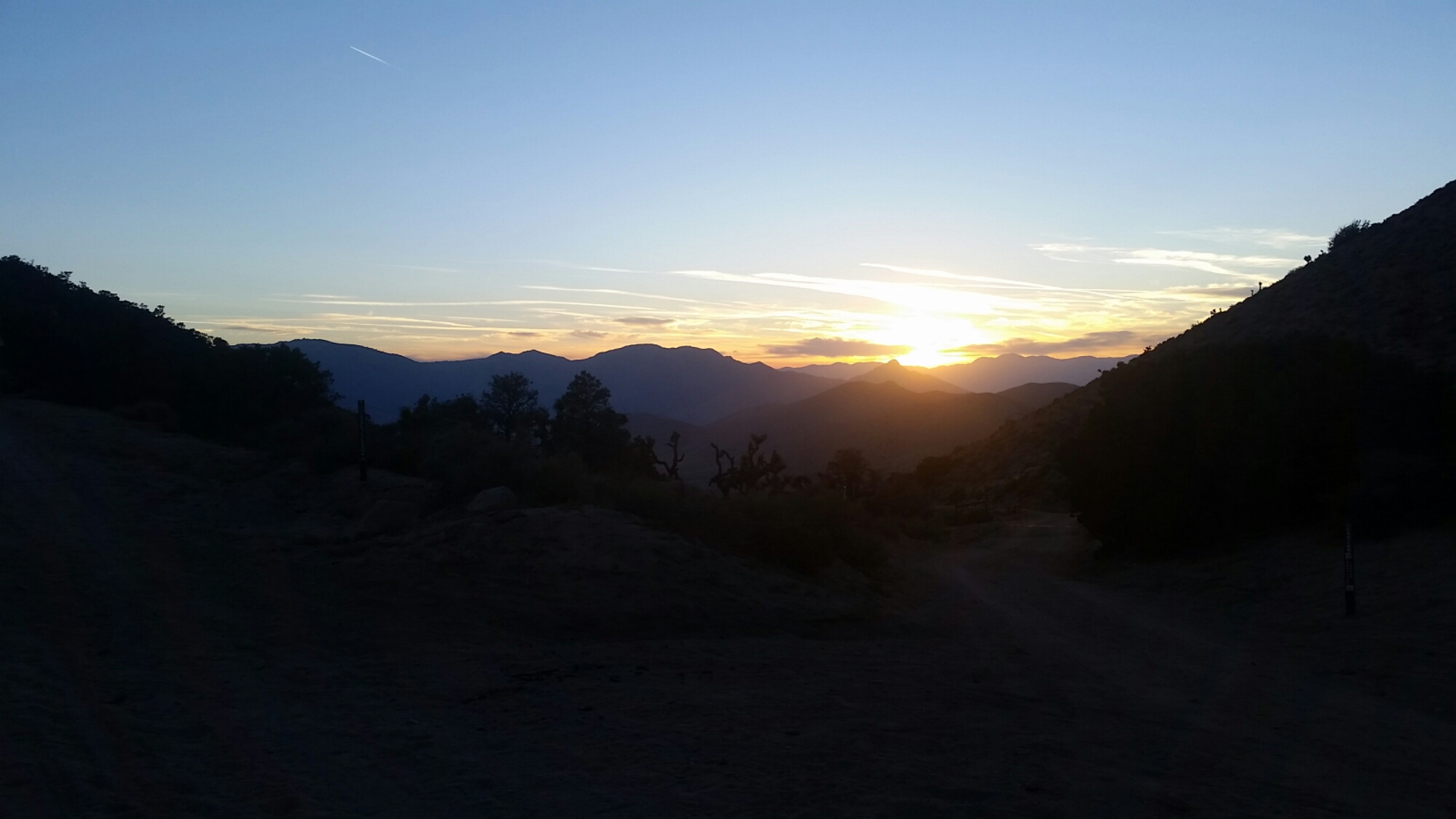 At Bird Pass a saint has maintained a water cache. There’s 100s of gallons of water lined up in huge blue plastic containers. I take 3 liters, and a strawberry poptart from the cooler. Exhausted, I toss my things behind a large joshua tree and watch it’s needle-bursts become night silhouettes. The sunset is brilliant, brilliant. I feel kicked, and beaten, and tossed about, but the evening sky is like a salve I spread out over my weary body.