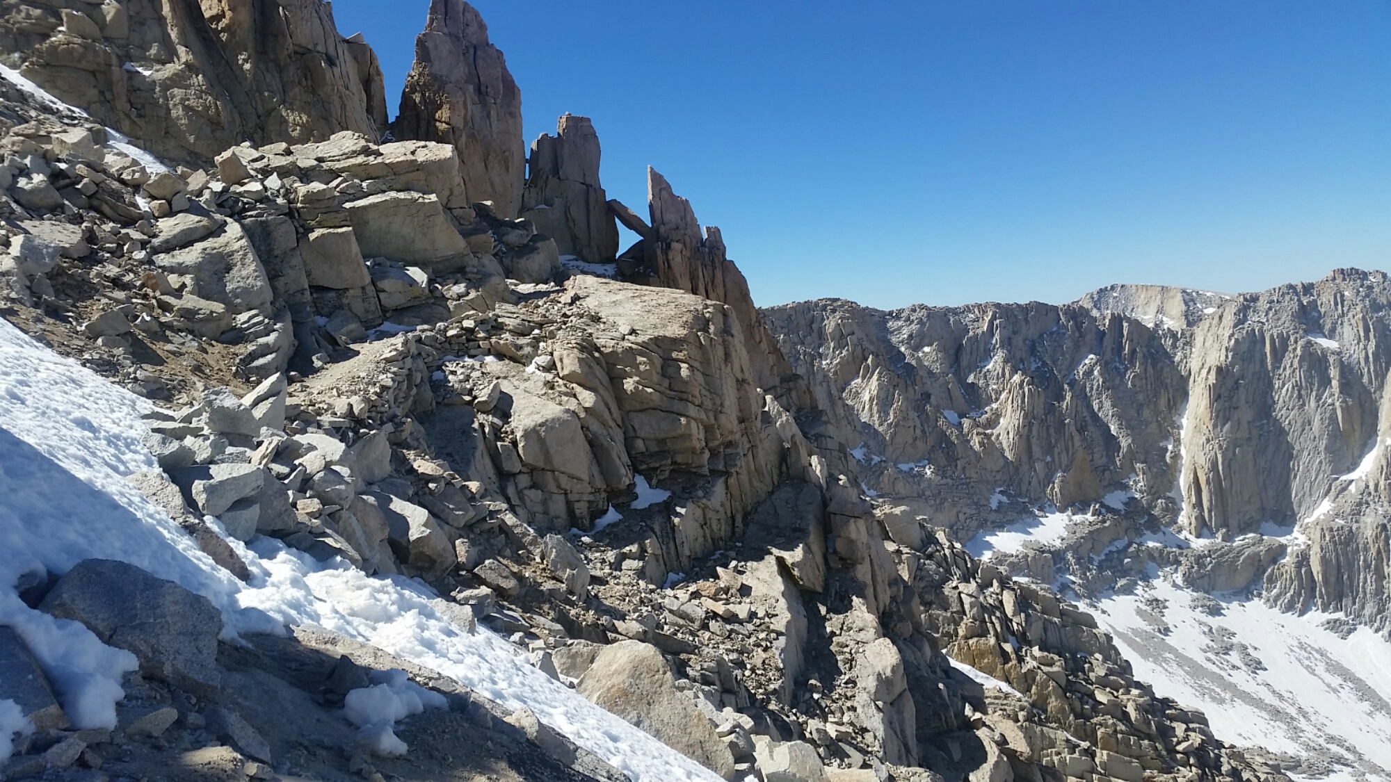 I’ve walked them both. The true and the not-true. Somehow I imagined it would be this way, just this way. The crowds and the shape of Guitar Lake. The slots that creep up on me and give a window out to the east, to the Owens Valley, to the desert that exists on every plane. The ice on the ledge and the steep drop down. A snowfield on the final pitch and the hut on the summit. The hazy views out in every direction and the blue sky above.