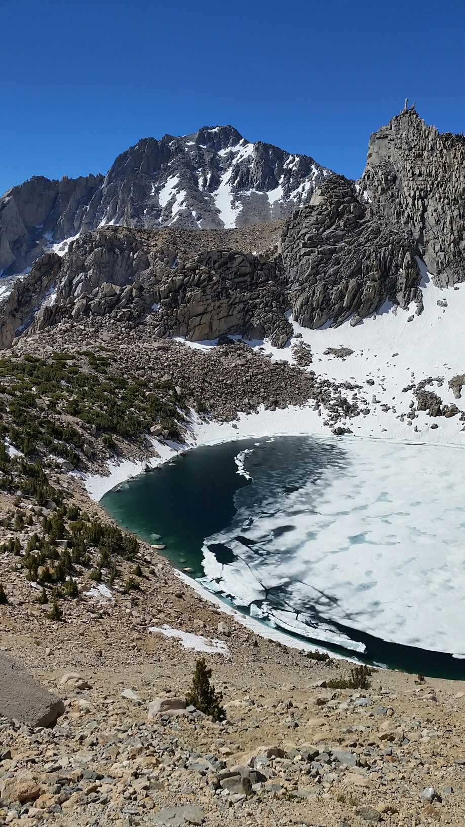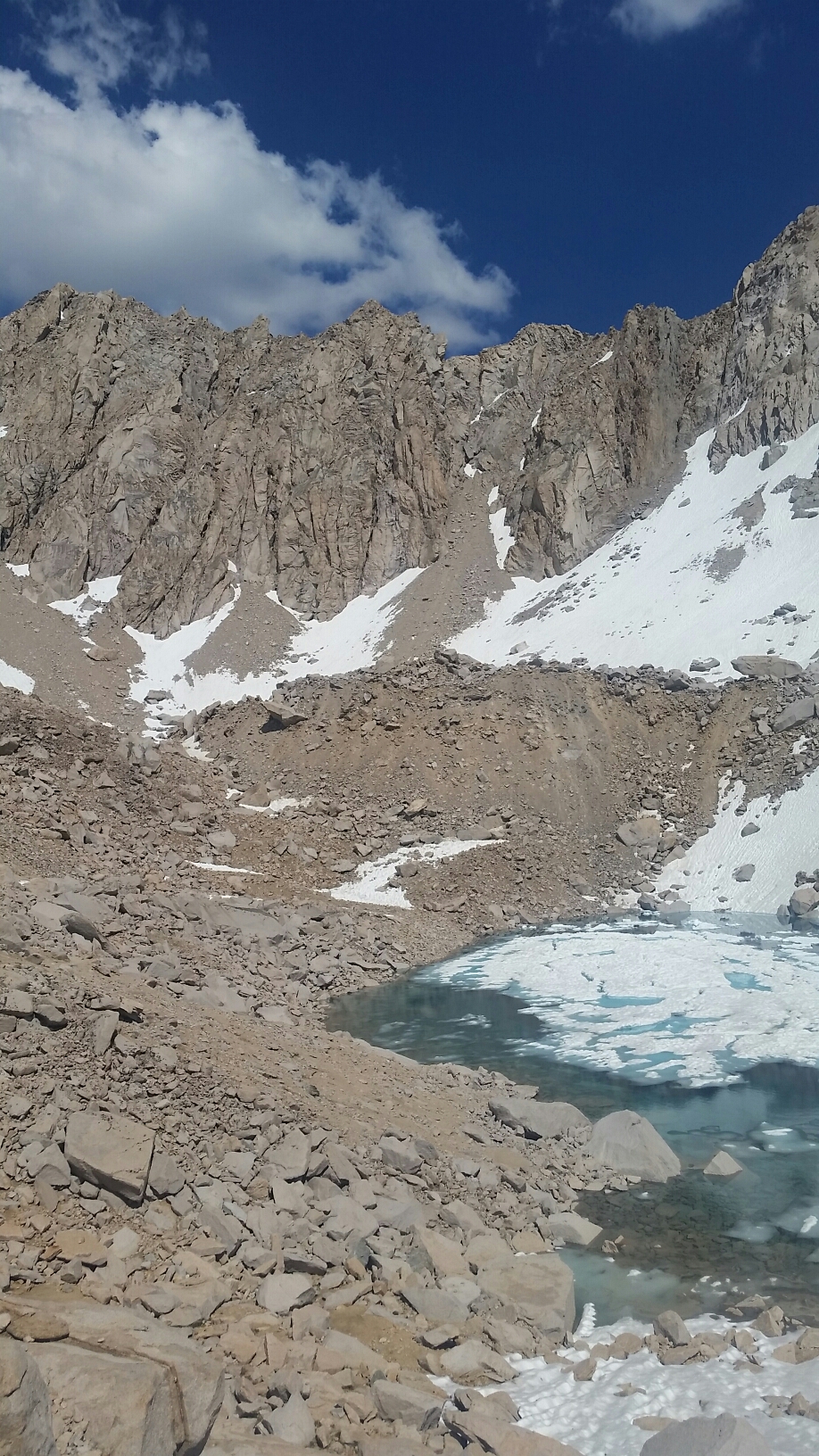 South of the pass there’s water covering the trail, turning it to a stream. Loose rocks everywhere I try and set my feet. At the base of the pass is a lake set deep into the earth, deep blue and mostly frozen over.