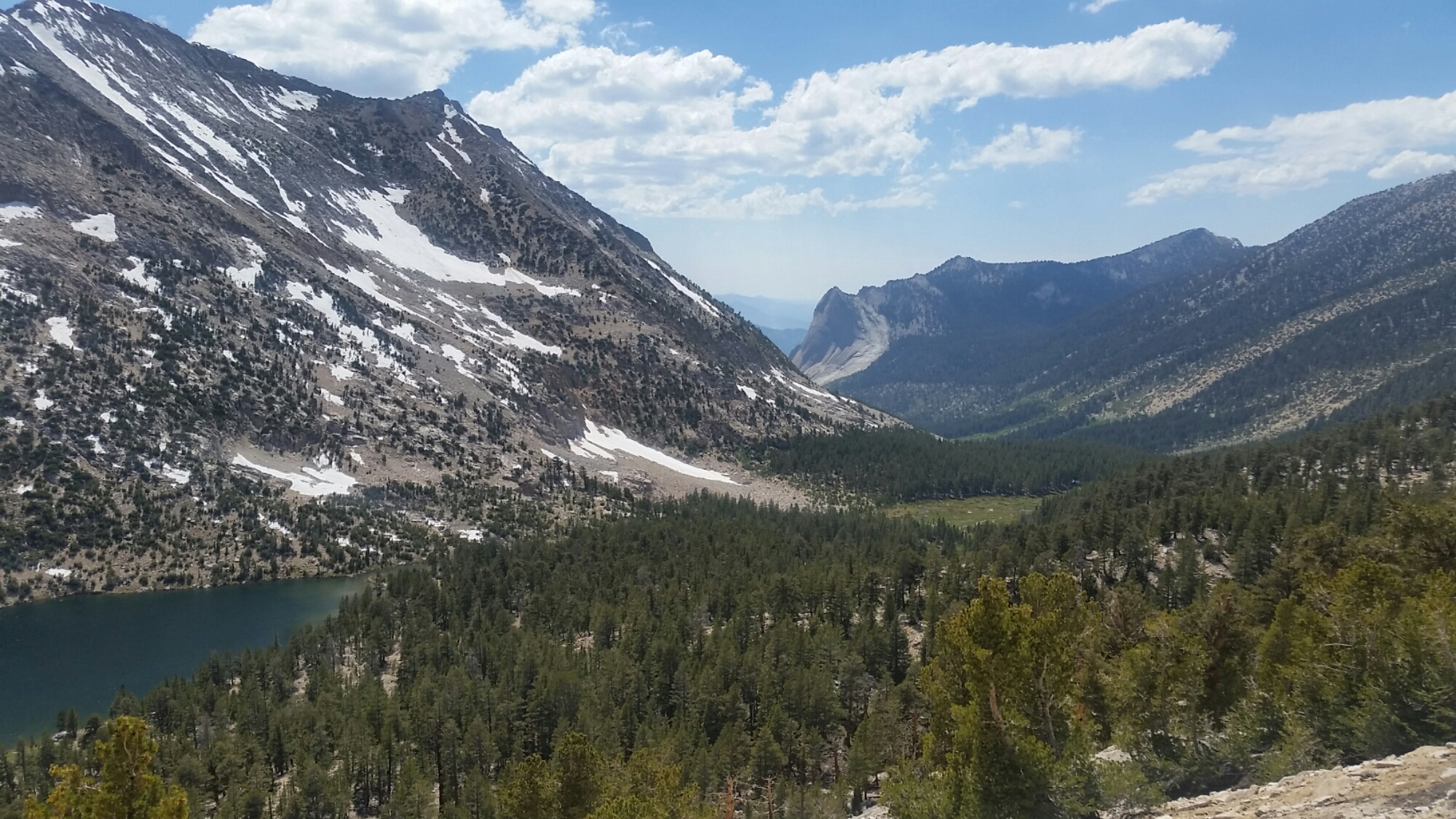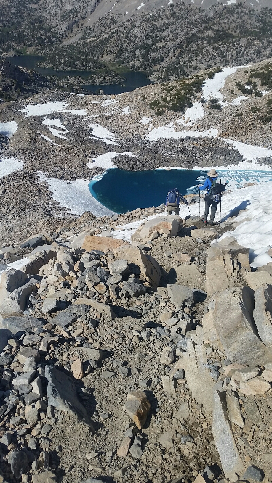 The trail crosses some easy snow fields and then pitches up until I’m standing on top, the Rae Lakes shimmering below.