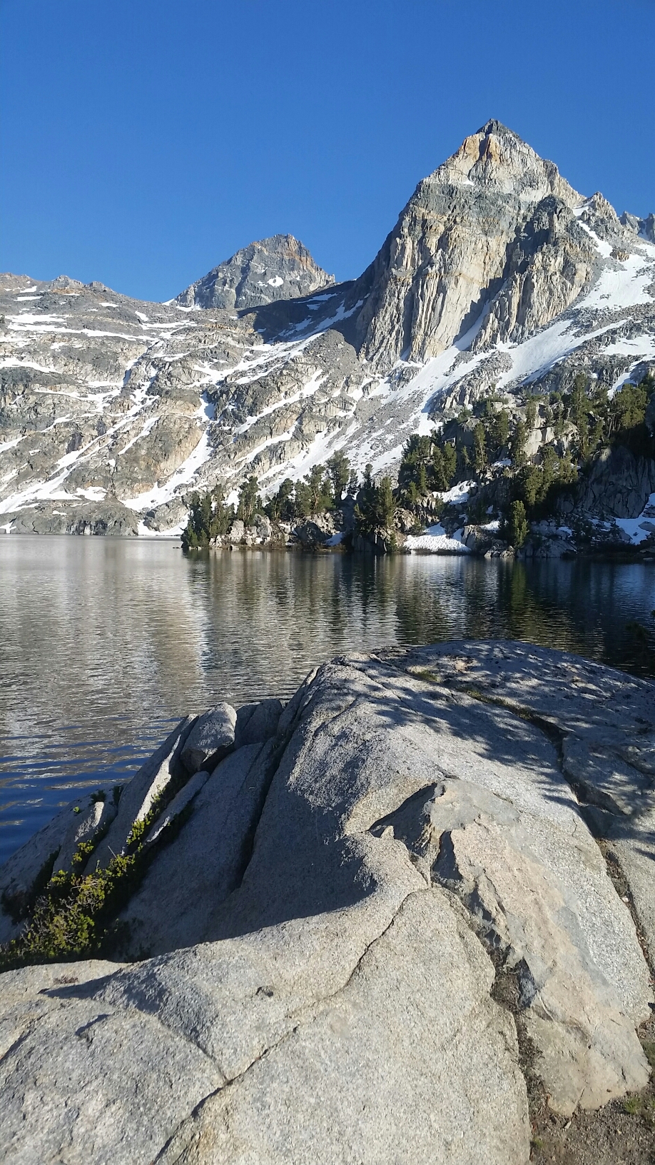At 6 I’m off the mountain and back among the lakes, Fin Dome rising over the lake. I talk with some John Muir Trail hikers which is a nice change of pace because the only people I ever see are PCTers. The mosquitos aren’t too bad yet and the sunset is great, so I enjoy a peaceful evening next to the water and stay up until it gets too cold to sit outside anymore and I retreat to my sleeping bag.