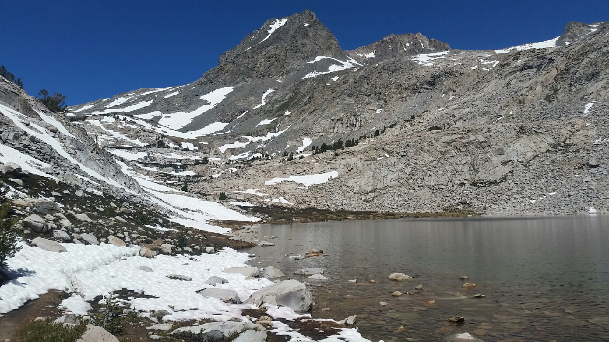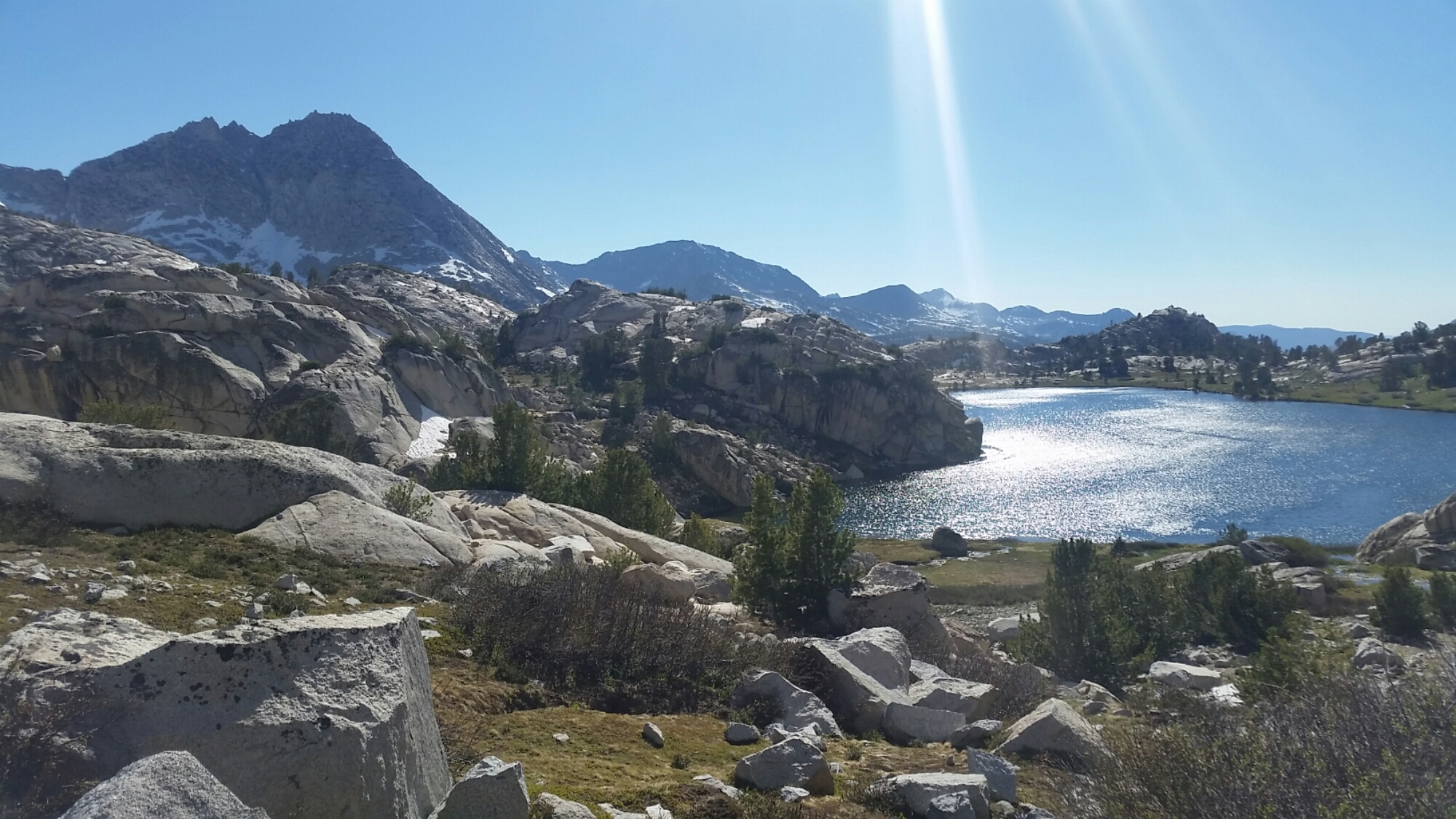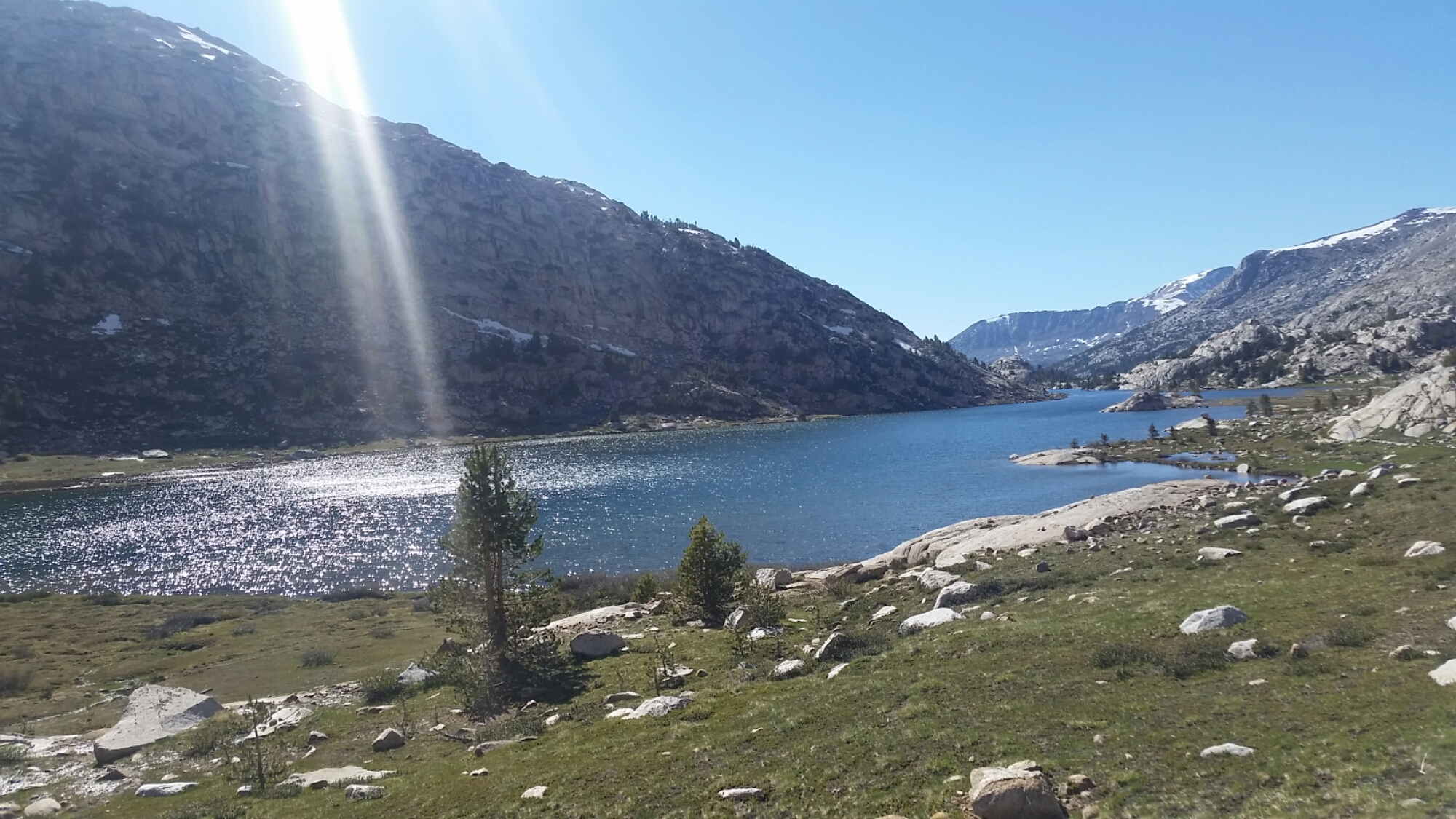 North of Muir Pass the snow receded. This is Evolution Lake, complete with sunbeam.