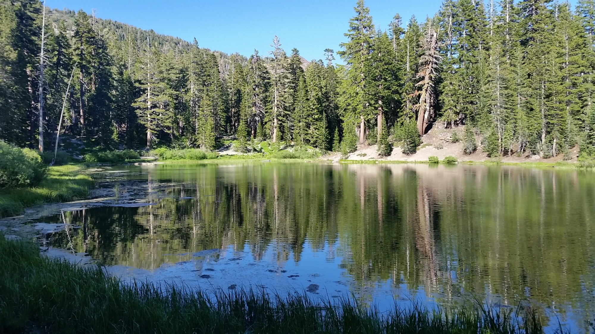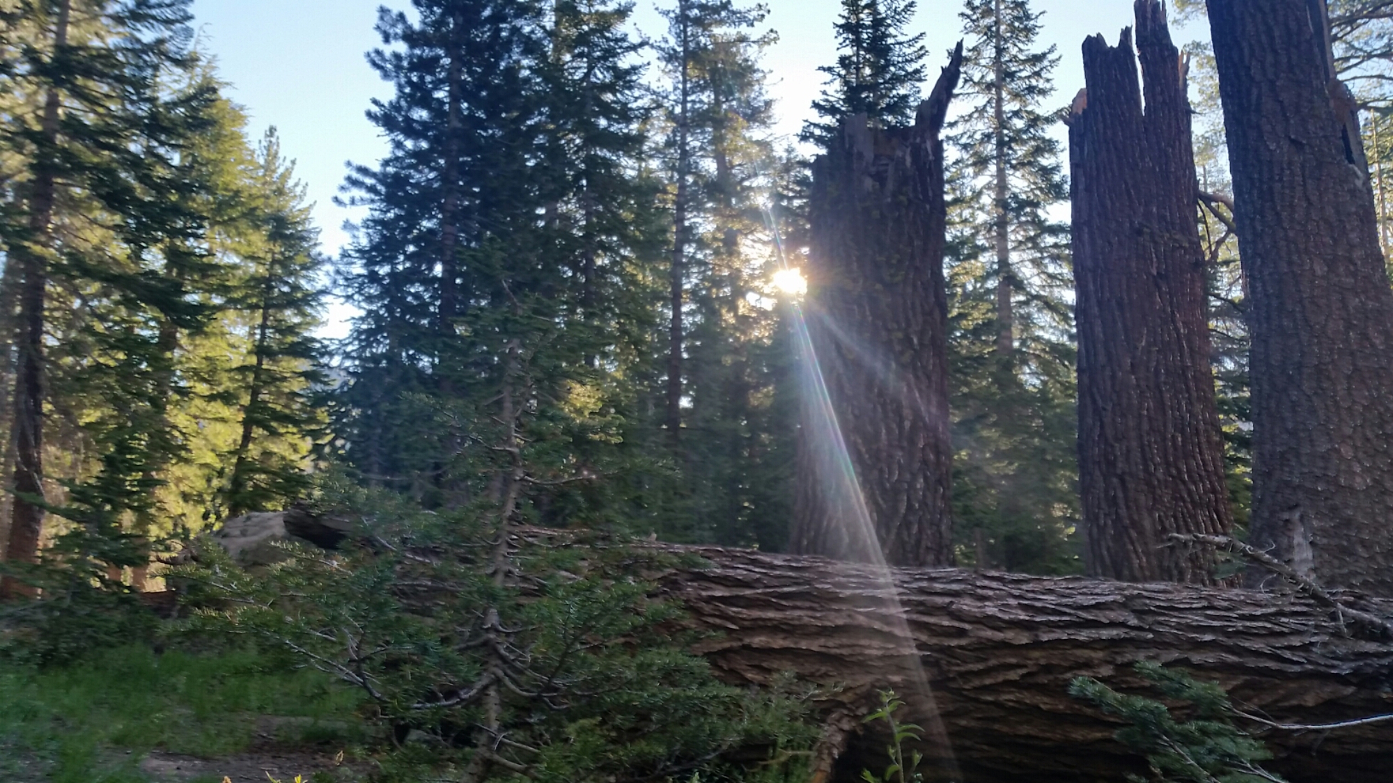 I decide to stop early and set up camp.  I can leave my stuff behind and walk a side trail up to Asa Lake. I don’t know anything about the trail or the lake, but it turns out to be only a quarter mile away and is more like a pond tucked away in the woods.  I was hoping for a longer walk and something more dramatic.  I lay my stuff down and sit on an old fallen tree, and play my music out loud since no hikers will come up here.  PCTers basically never go off trail, since our trail is long enough already.