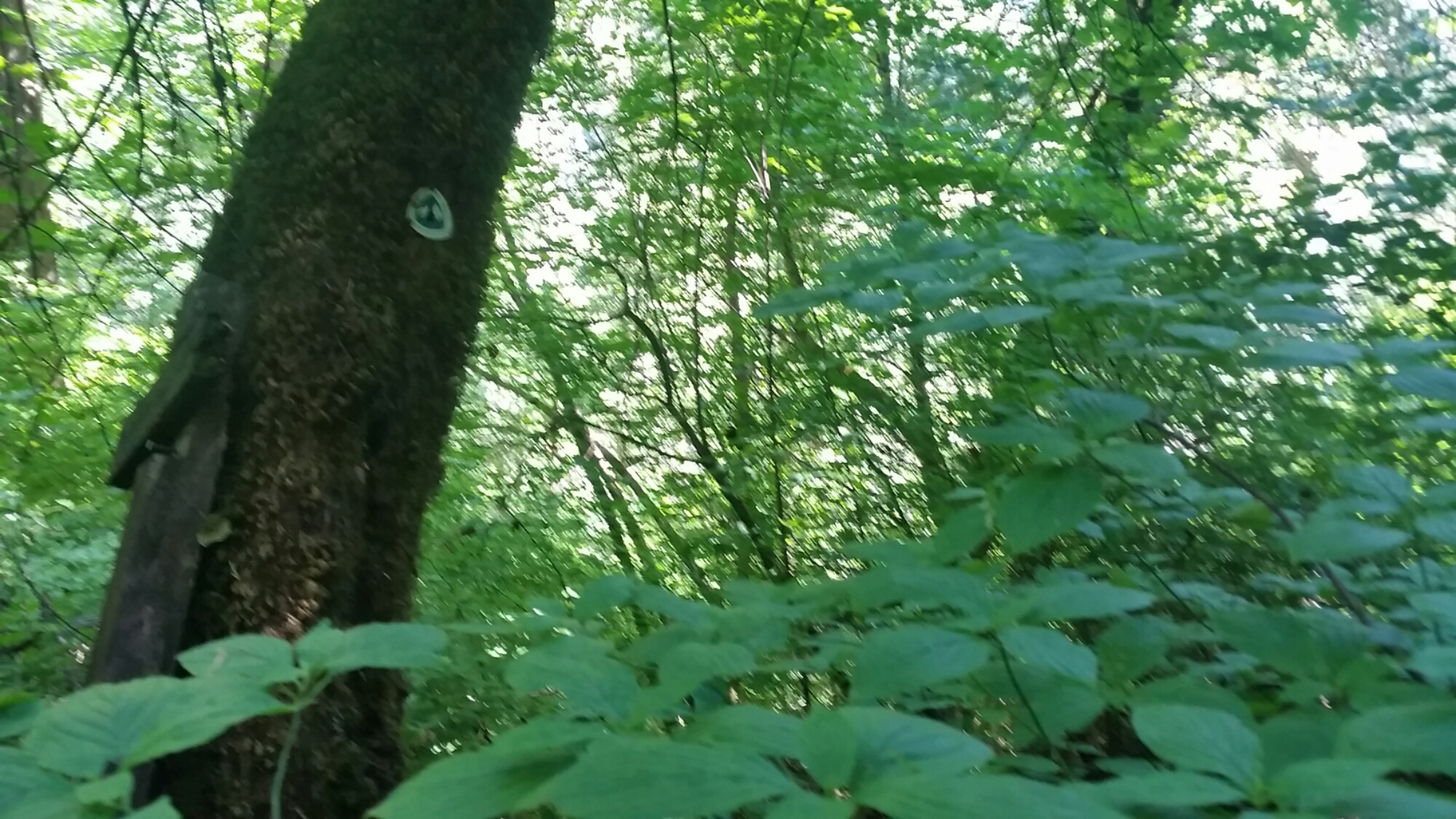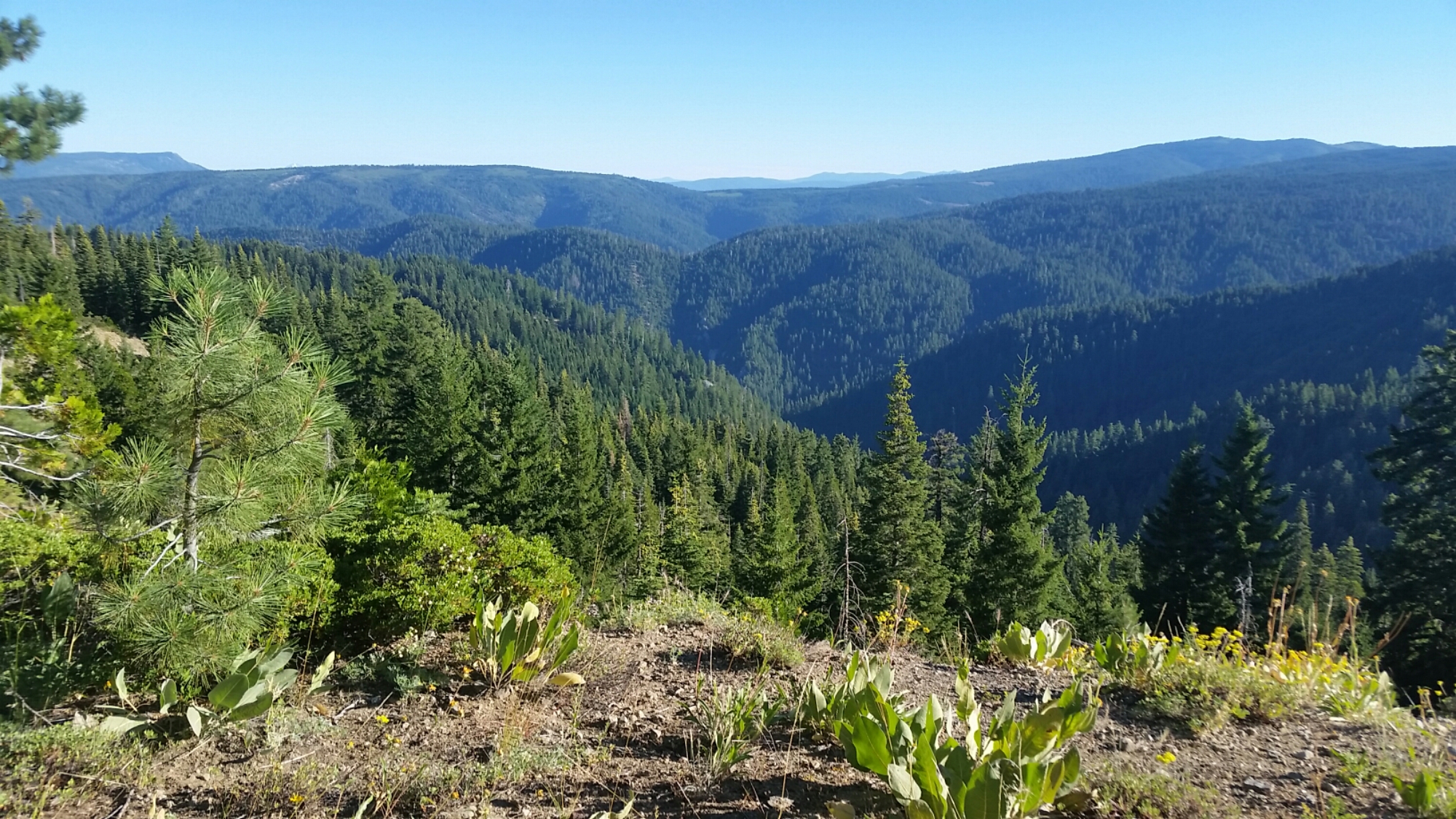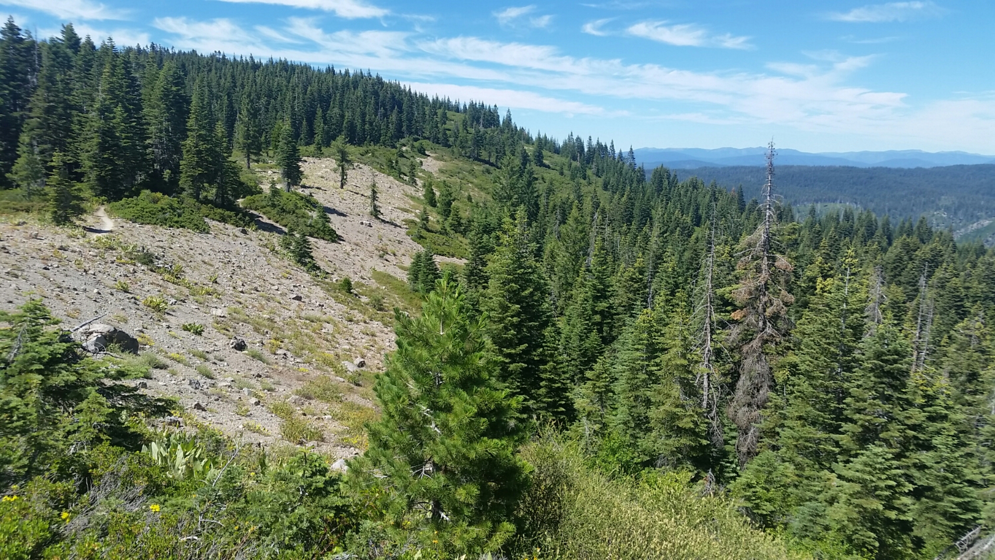 I also dropped all the way down to 3100 feet elevation, which has to be the lowest I’ve been in a while. On the way I passed through a big dark forest where nothing grows on the ground. Just sticks and fallen trees and dirt and pine cones. Then, it was like being in the Ozarks with deciduous trees and springs and creeks flowing here and there. For a while the air seemed to turn green from the light coming through all the leaves. I haven’t seen actual leaves in months…