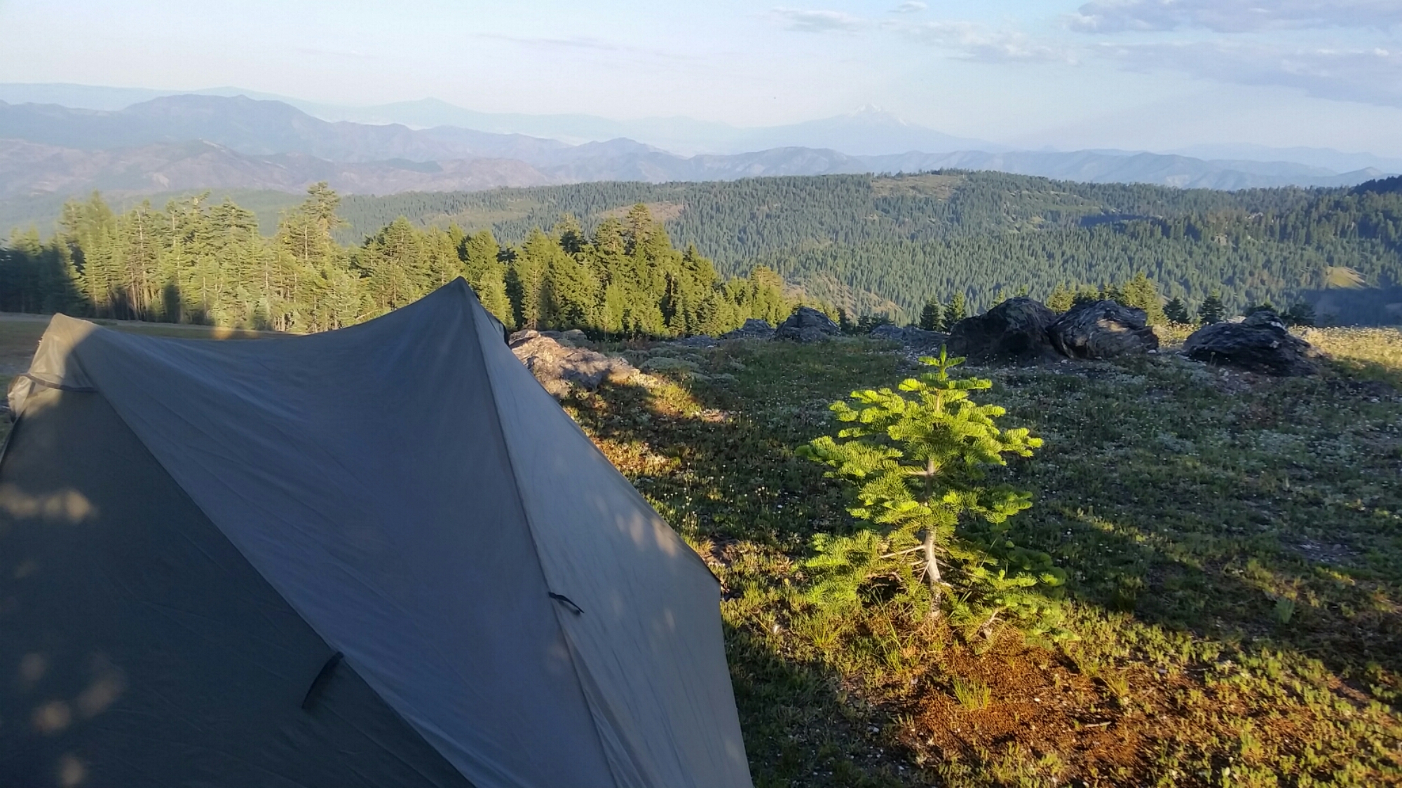 The clouds came out today. Not rain clouds, and not overcast clouds that block the sky, but nice small puffy ones that obstruct the sun and keep me cool as I walk up and around this wilderness. By evening they’ve cleared out and I’m walking on a big bald with open views to the east and west. It’s almost quitting time, so I walk along the edge of the field where trees meet open grass and rocks and sky. I find a sheltered spot, off trail, unofficial. It’s my own little secret spot with a perfect view of hazy old Mt. Shasta, that perfectly reliable vantage point. Sometimes I wonder if I’ll be able to see Shasta from Canada.