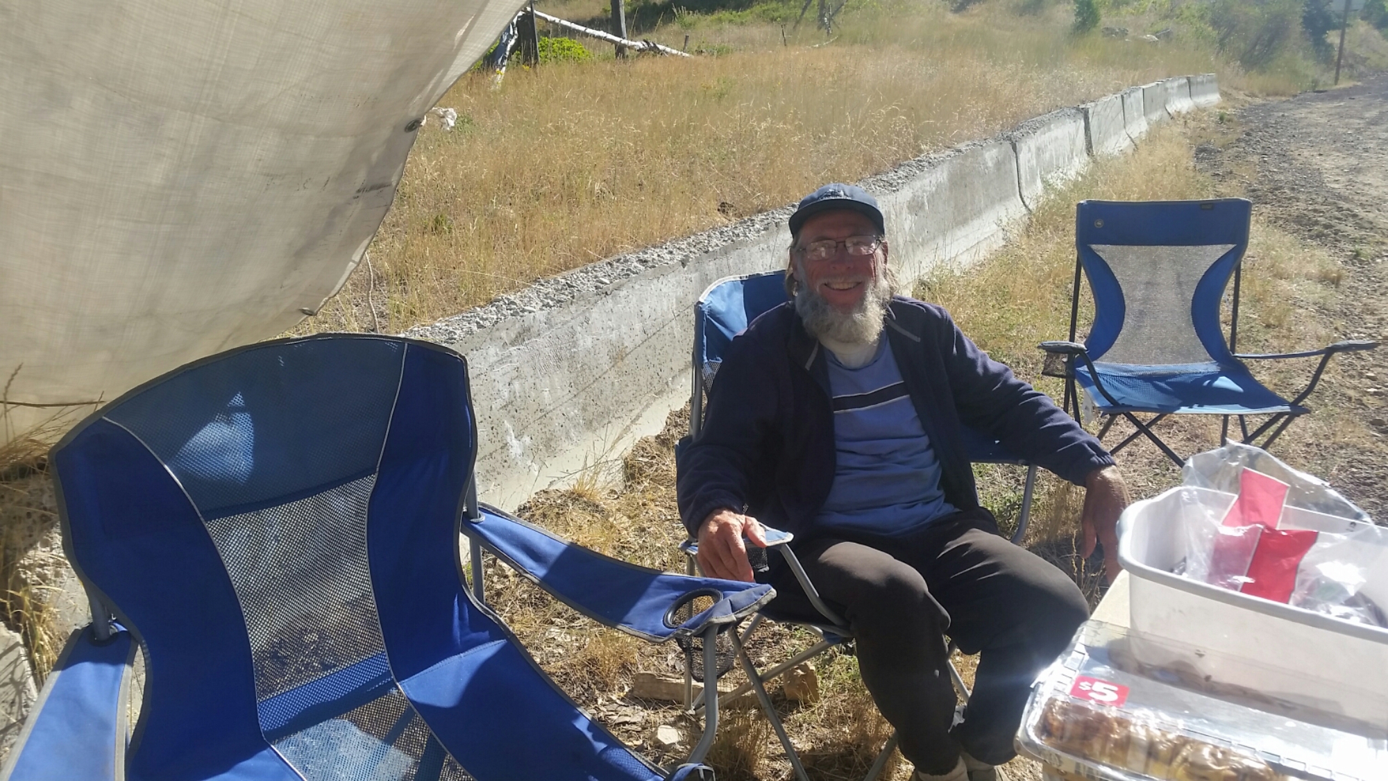 Coppertone, at home in his little RV with his table of snacks and chairs for us hikers