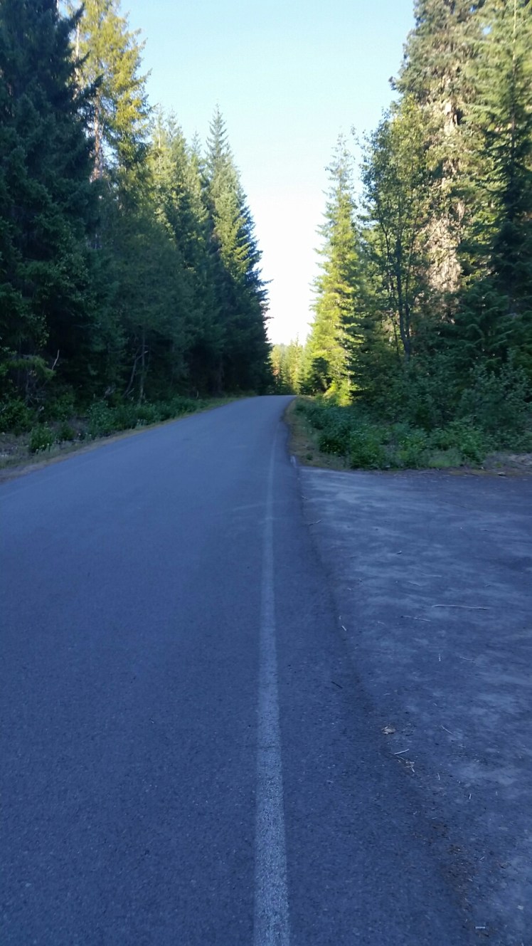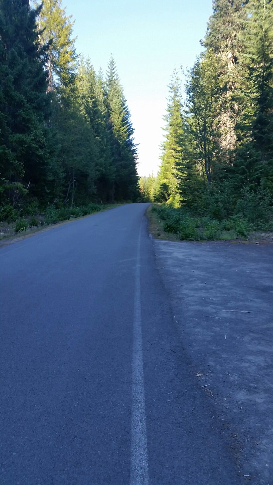 Walked through the great Pacific Northwest Huckleberry Highway today and got stained teeth to show for it.  Stopped so often to eat the fruit off the bushes that I have no idea how I walked nearly 30 miles.  Natural energy I guess.  I got a few good glimpses of Mt. Adams, including one from a lonely forest service road at dusk that made me feel like I was in some rural forgotten place.  Quiet roads in the woods will do that, and this particular one leads nowhere at all.