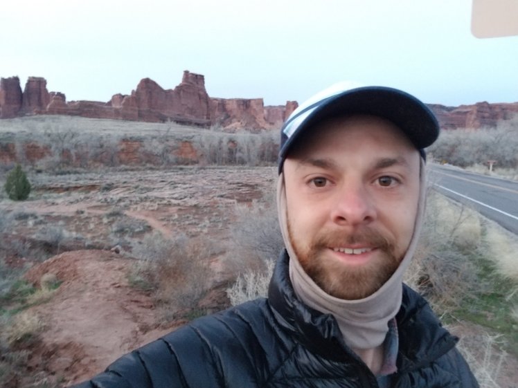 By 6:30 I was in the common room of Lazy Lizard Hostel eating the dregs of a community jar of extra crunchy peanut butter. As I topped off my cell phone battery a couple of early risers filled in the room and I casually asked one if he was going in to town this morning. No, he responded, in fact he had nothing at all to do for the day. I took full advantage and suggested maybe he give me a lift to Arches, and he was game, so before the sun was even up I was back in route to get this hike going.