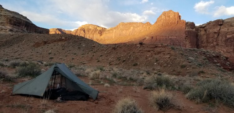 By days end I come to the rim of Fiddlers Cove and made the steep climb down (750 feet in .1 miles!!) into the canyon where a tiny stream flows with only mildly silty water. Climb out of one canyon on the morning, and drop into the next one in the evening. Symmetry. By dinnertime I’ve reached the confluence of Hatch Canyon and the Dirty Devil River to find a sandy beach to camp on with a easterly view down canyon. A nice 20 mile day felt good after all my hitchhiking yesterday, and the canyons seemed happy to have me too–they glowed bright and red in the setting sun and brought on nightfall with hardly a breeze.
