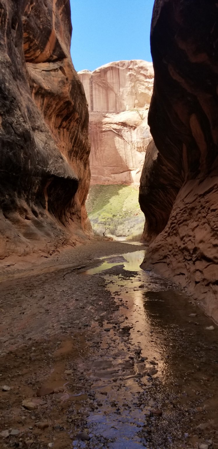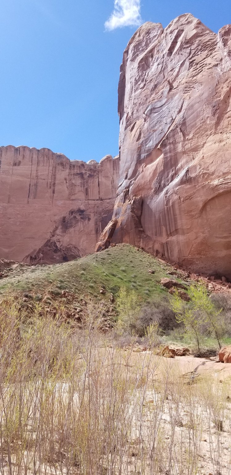 Spring also is beginning to make its yearly appearance, and for the first time all trail. Many of the small bushes throughout the valley have tiny green shoots rising from their stiff twig-like branches. The cacti are still without bloom, but give the impression that transformation is imminent–their bodies appearing to blush and grow plump, ripe. Tiny flowers, minuscule even, show up between rocks and look like pin-pricks of blood rising up out of the sand. So bashful are these botanous creatures that one must bend down and tilt ones head to the earth to examine them.I walk on, down the length of Hall’s Creek, aiming for Lake Powell, a day’s journey to the south. And then, stepping up out of a creek bed, backpackers! Only the 2nd pair I’ve seen all trail long! Sue and Will hail from Denver and have spend a few decades wandering these canyons. We have a great conversation and I learn they do some trail-angelling along the CDT, and I inform them of my plans to hike that trail as well this summer. I hope to see thes again, and before I leave Sue hands me a package of bars for some extra calories during this long stretch.By early afternoon I’ve arrived at the highlight of the day and possibly the whole trip (let’s count howany times I can say that) as I step into Hall’s Canyon, an absolute marvel featuring a few narrows and massive sheer rock faces. A stream winds through the whole thing, and a few times I’m forced to wade waist deep when the walls close in tight. Exhilarating!