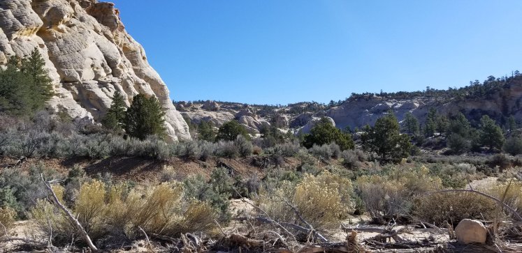 No Man’s Mesa rises uo out from the valley, one of its sides caved in so that a natural staircase leads up its slopes. Beyond, the White Cliffs break apart to the east and west, marking their territory by gleaming white in the mid morning sun. Only half a day outside of Bryce Canyon, and that distinct landscape has been rinsed out, as if the storm took it on it’s way east. And where were these cliffs and mesas when I was high on the ridge of the Grand View Trail? The world hides itself so well, and for what reason?